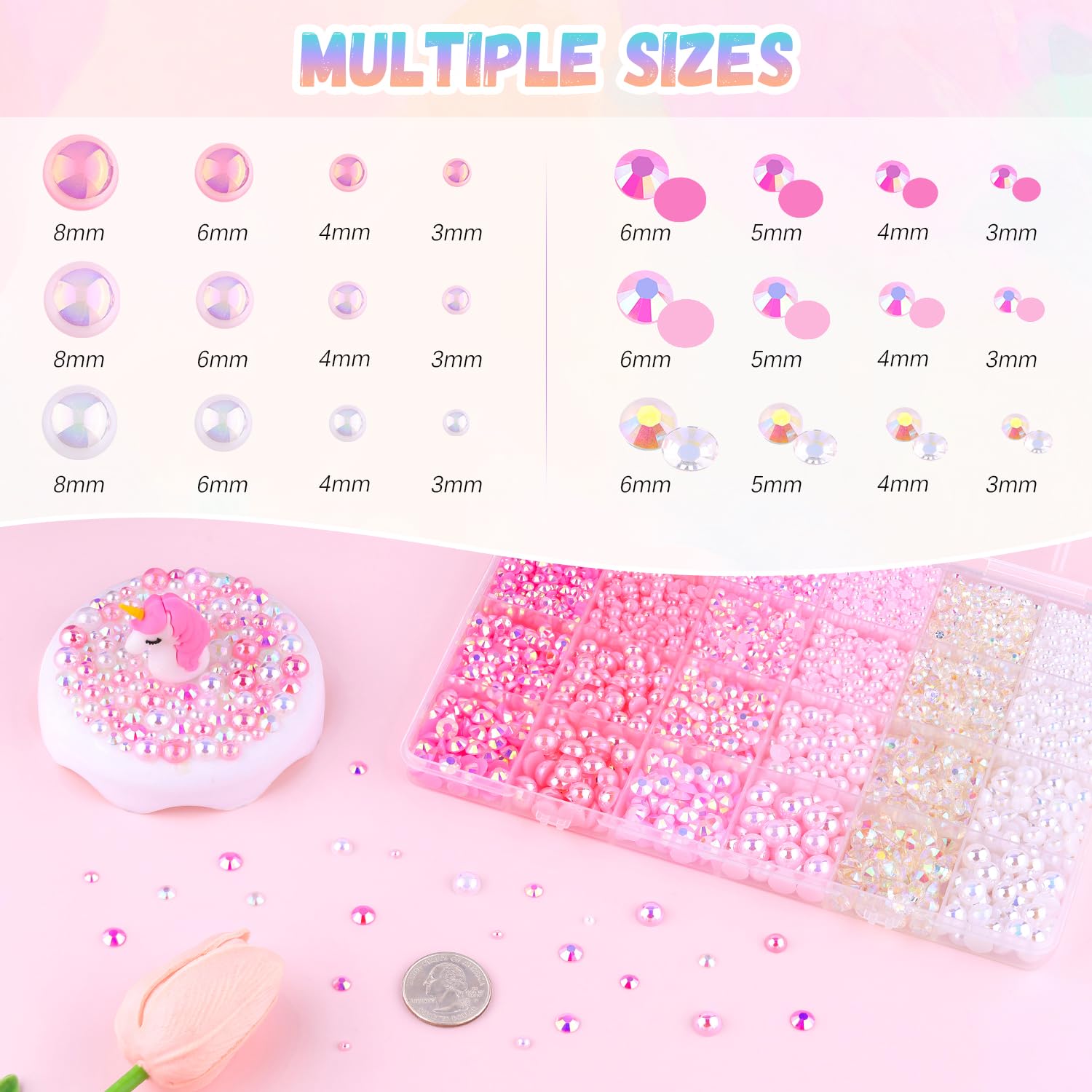 - MIXED SIZE: This set contains four sizes of half pearls (3/4/6/8/mm) and four sizes of round rhinestones (3/4/5/6mm). Each gem comes in 3 different colors. The various size range of pearls and gems can be used for nail art, craft, and decoration.