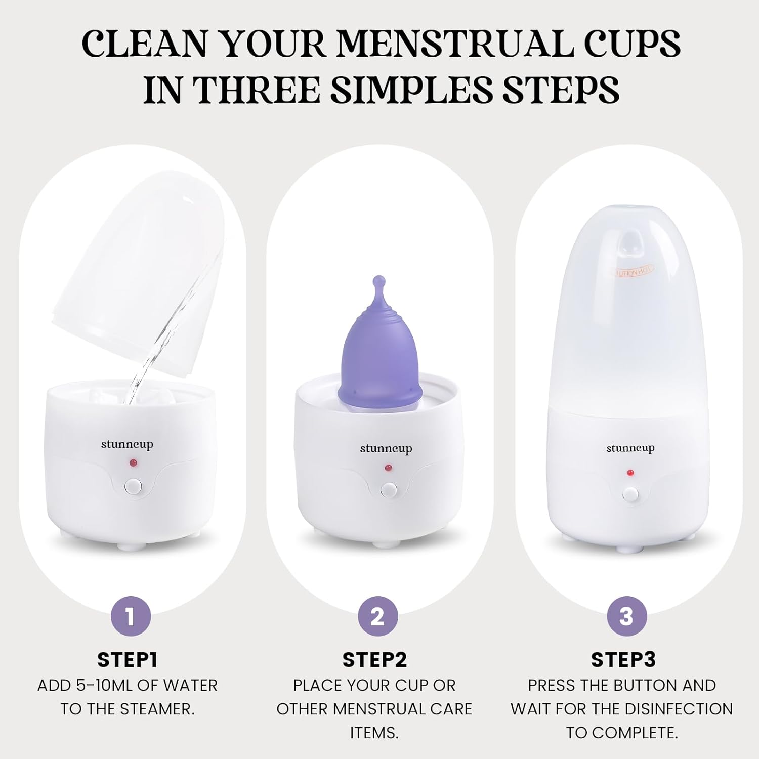- - 3-Minute Magic - Say-goodbye to boiling menstrual cup or messy routines. Just add 5-10ml water, press start, and let steam do the work! Fits all period cup sizes and shapes, even menstrual disc.