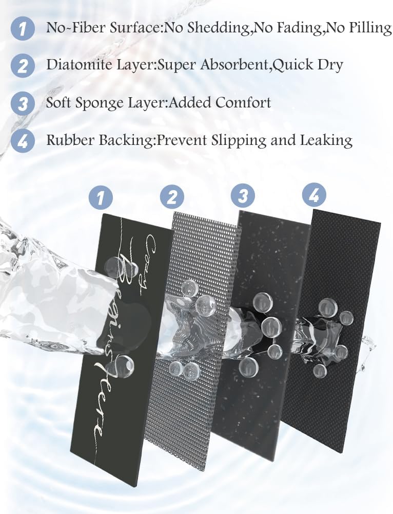 - Innovative Soft Diatomaceous Earth Bath Mat: Experience the perfect blend of comfort, functionality, and innovation with our luxury bath rug. Bathroom floor mat features a smooth leather-like surface for easy maintenance, a cushioning sponge layer for added comfort, a super absorbent and quick-drying soft diatomaceous earth layer, and a durable rubber backing for added stability.