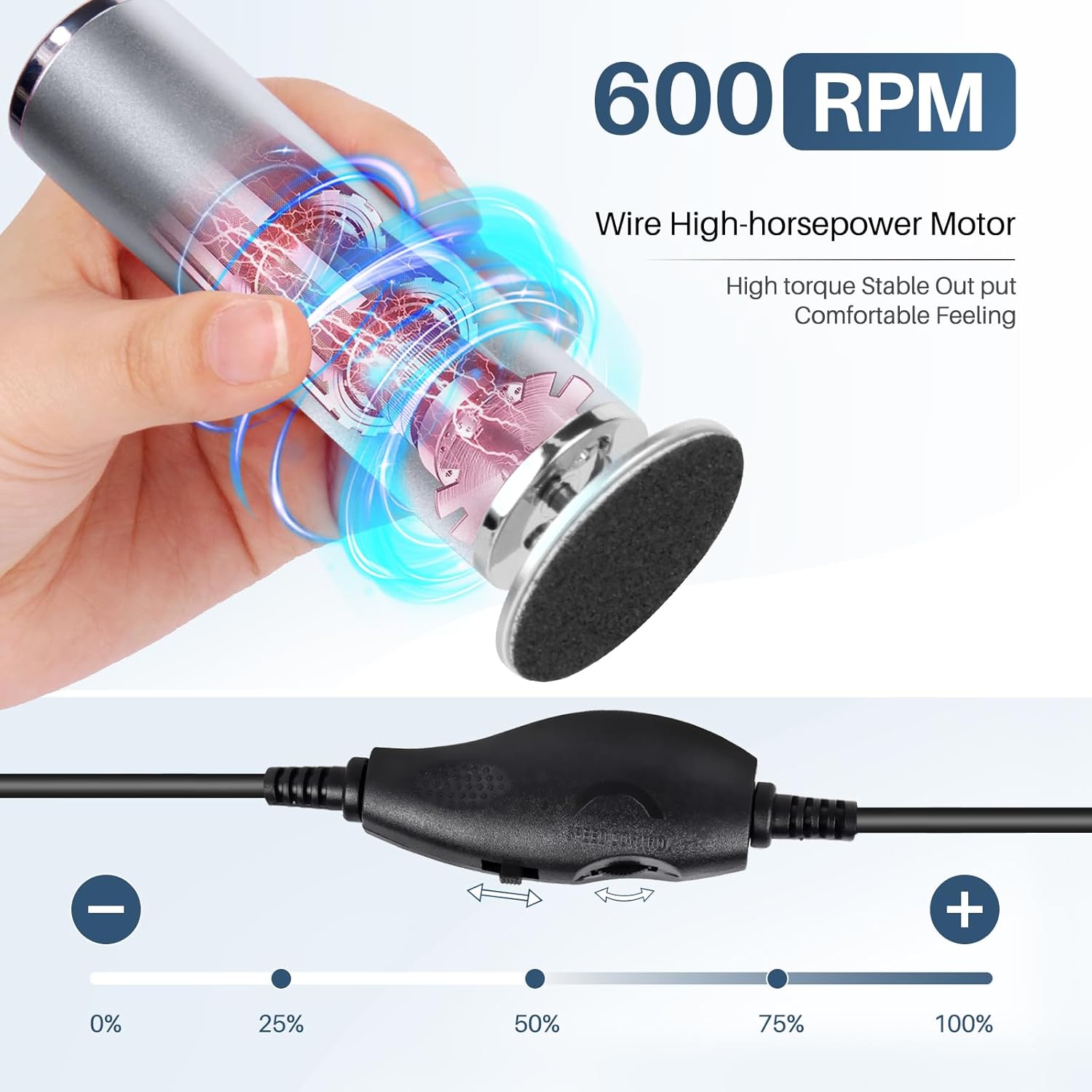 - 【Profesional Pedicure Tool For Feel】The motor of our foot callus remover is made from high-density material,Equipped with High-Precision Motor (0-600 RPM max) ,This allows for rapid acceleration and instant deceleration, Plug-in power is designed to provide strong, continuous power that not only eliminates the need to recharge batteries, but also saves time and effort compared to manual foot file.