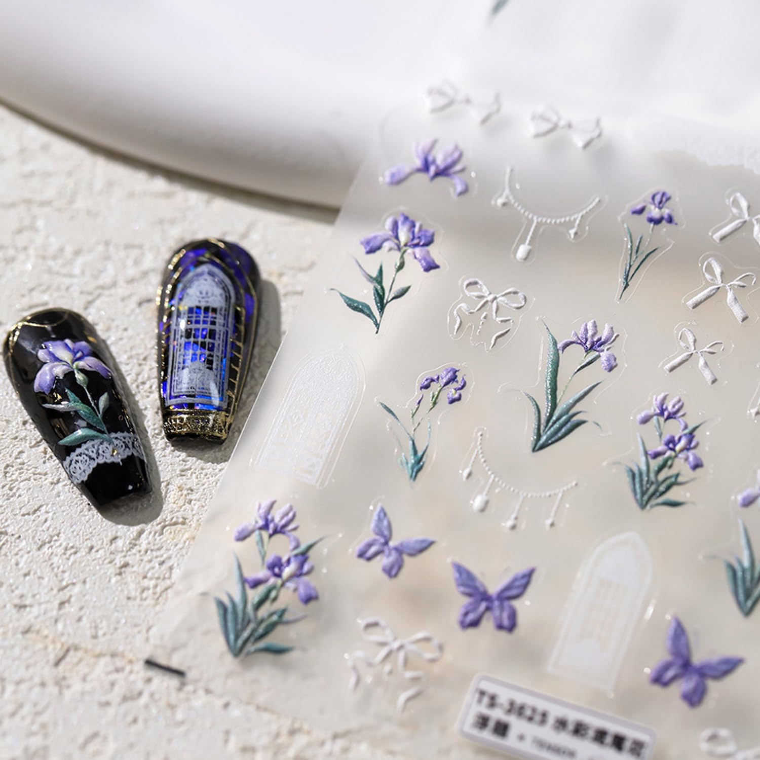 Flower Nail Sticker, 5D Embossed Iris Floral Nail Art Stickers Self-Adhesive Bows Butterfly Nail Decals for Women Nail Supplies Art Design Sticker(1, Iris Flower)