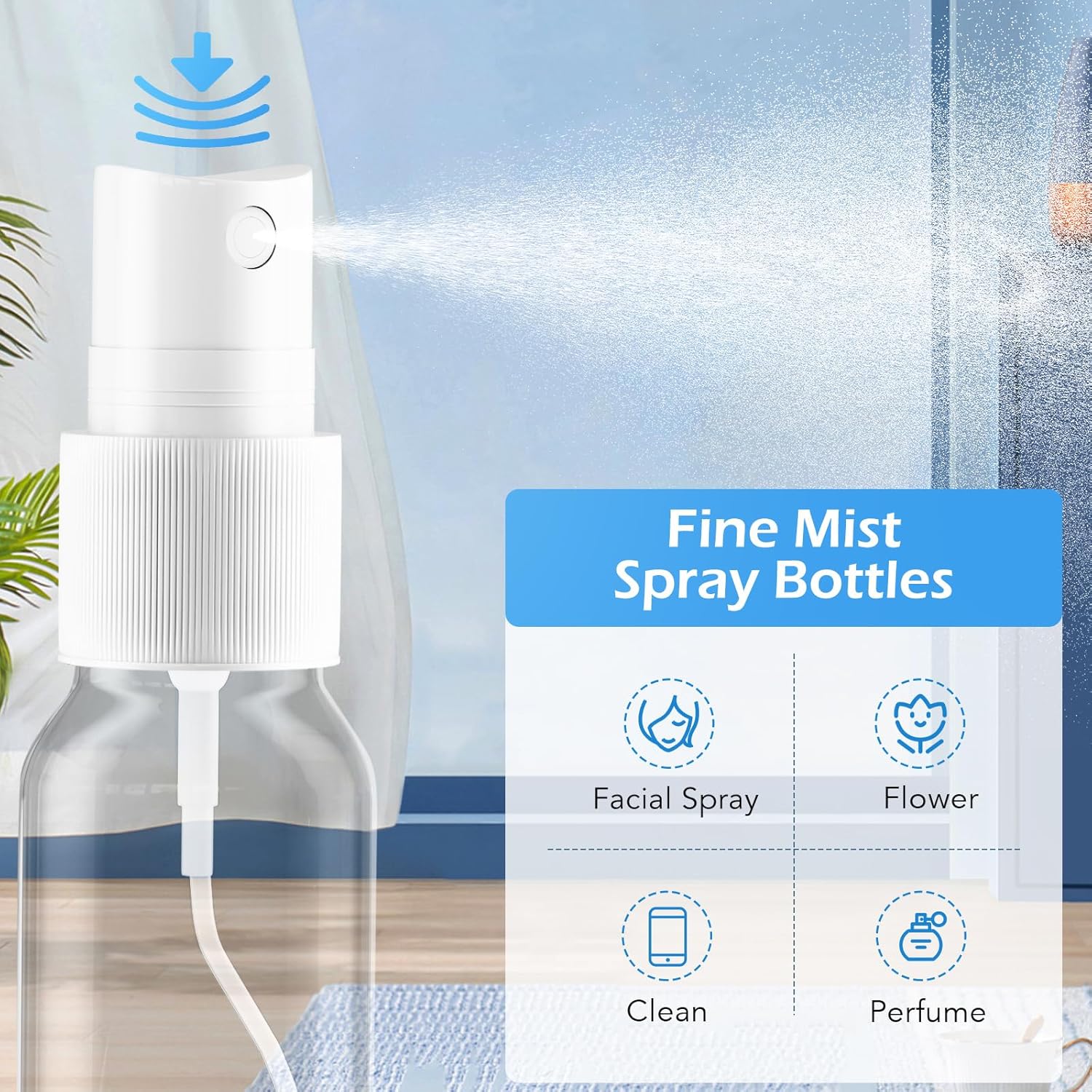 Spray Bottles, 2oz/50ml Clear Empty Fine Mist Plastic Mini Travel Bottle Set, Small Refillable Liquid Containers with 2pcs Funnels and 24pcs Labels (12 Pack)