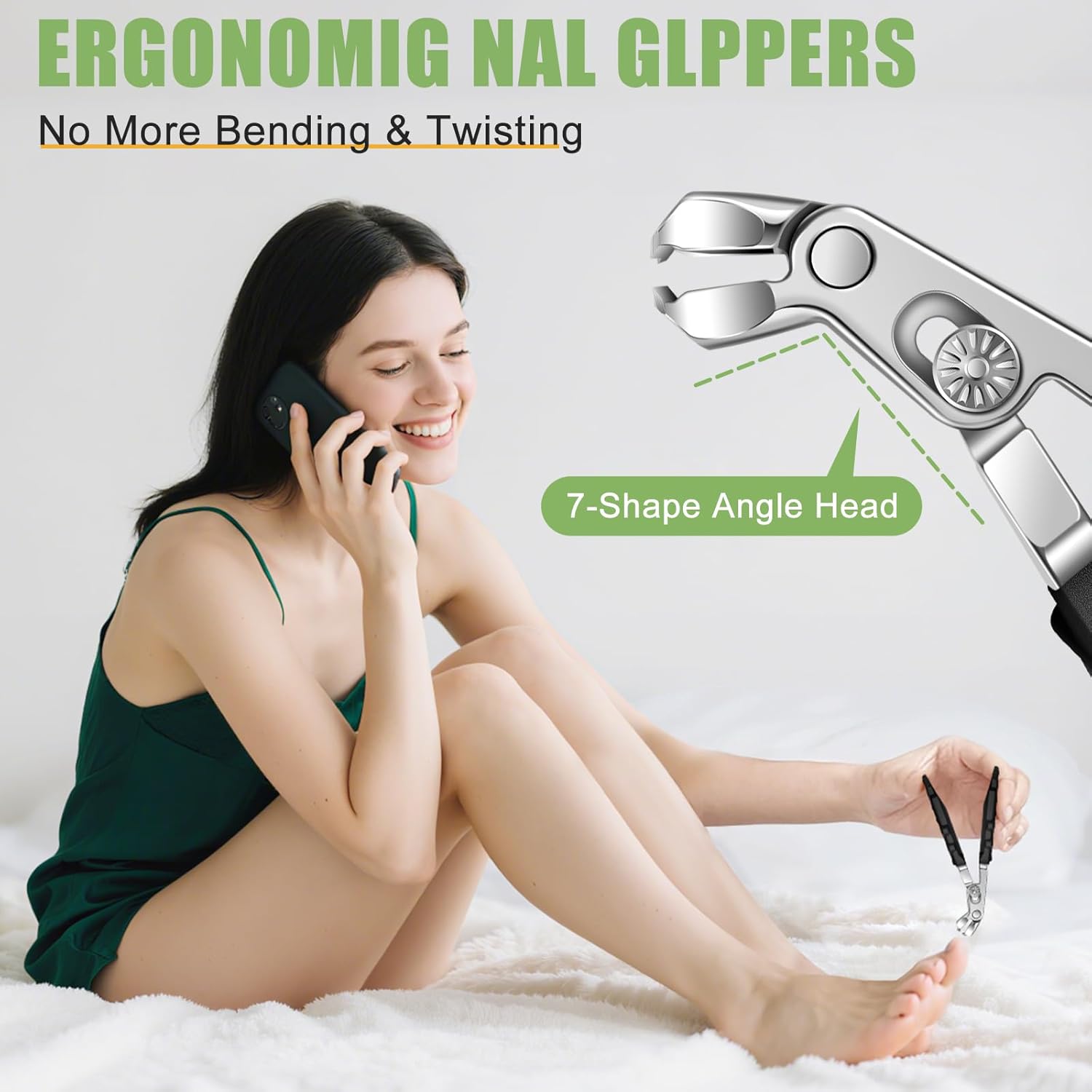 - ERGONOMIC ANGLED HEAD NAIL CLIPPERS FOR SENIORS - The angled toenail clippers adopts an ergonomic design with a curved 7-angle head, which allows you to clearly see the edge of the blade and the nails, so that you can cut nails accurately and confidently. The newly upgraded nail clippers with a catcher feature a splash-proof design and a wide Jaw curved blade that can open up to 7 mm, enough to trim any thick nails