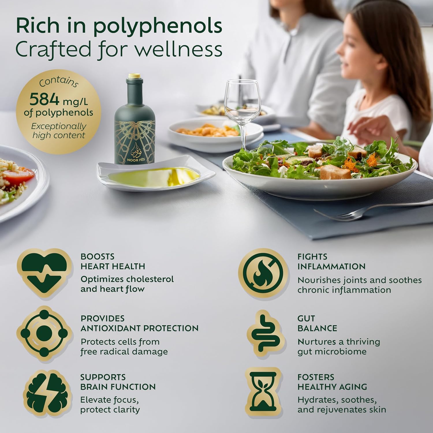 NOOR FÈS USDA Organic | 20+ Awards 584 mg/kg Polyphenol Rich | Premium Extra Virgin Olive Oil | Moroccan Cold Pressed EVOO | Less than 0.15% Acidity | Handpicked Picholine Olives | Pack of 2