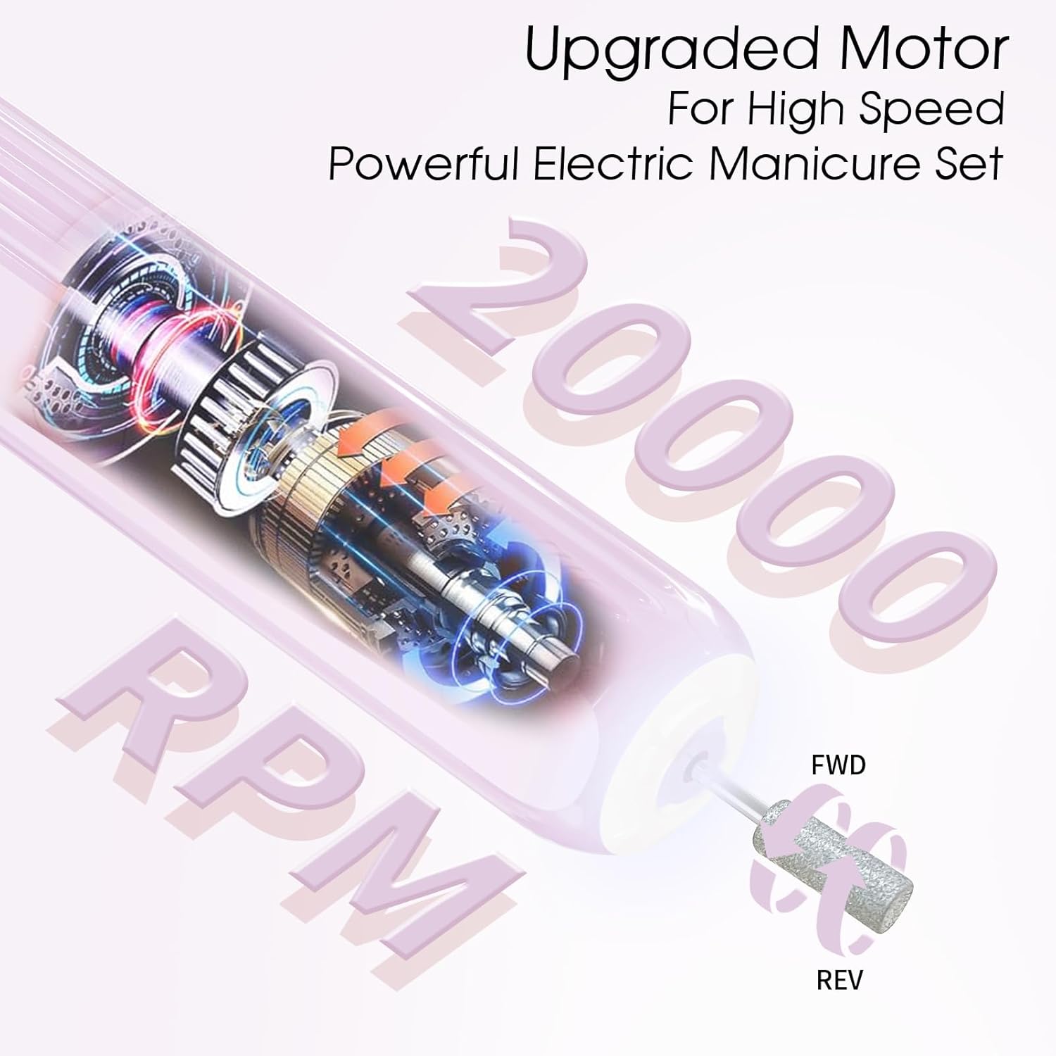 - Easy to use, Even for Beginner: This electric manicure pedicure kit have 3 adjustable speed 0-20,000rpm and designed with forward and reverse rotation directions,choose the appropriate speed and rotation for your needs; ergonomic body design for comfortable holding, speed and direction controlling. Easy to use, enjoy a salon-quality professional manicure pedicure at home. EVEN BEGINNERS CAN USE THIS ELECTRIC NAIL FILE WITH EASE !