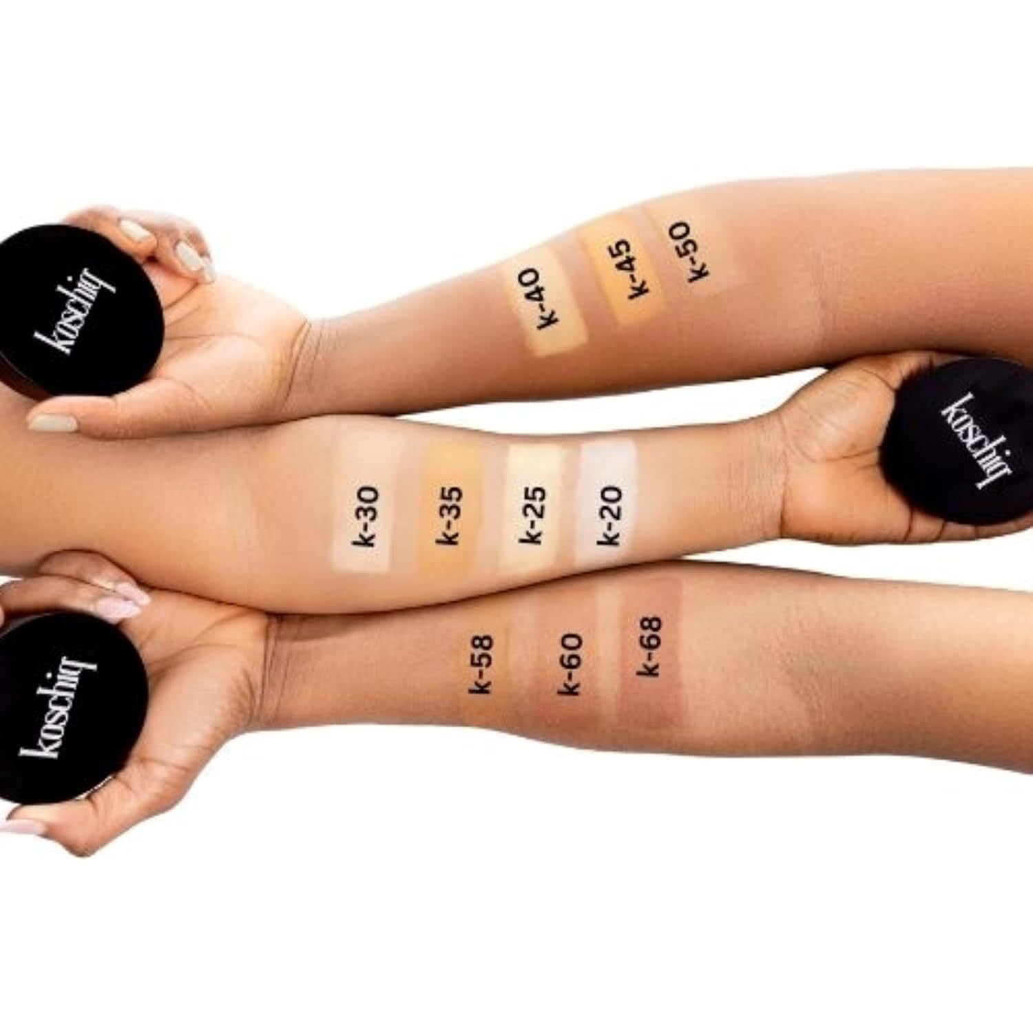 - KOSCHIQ COSMETICS: provides you with a soft matte powder plus foundation that can be used as a foundation and also on top of a foundation , leaving the skin younger and fresher all day, everyday.