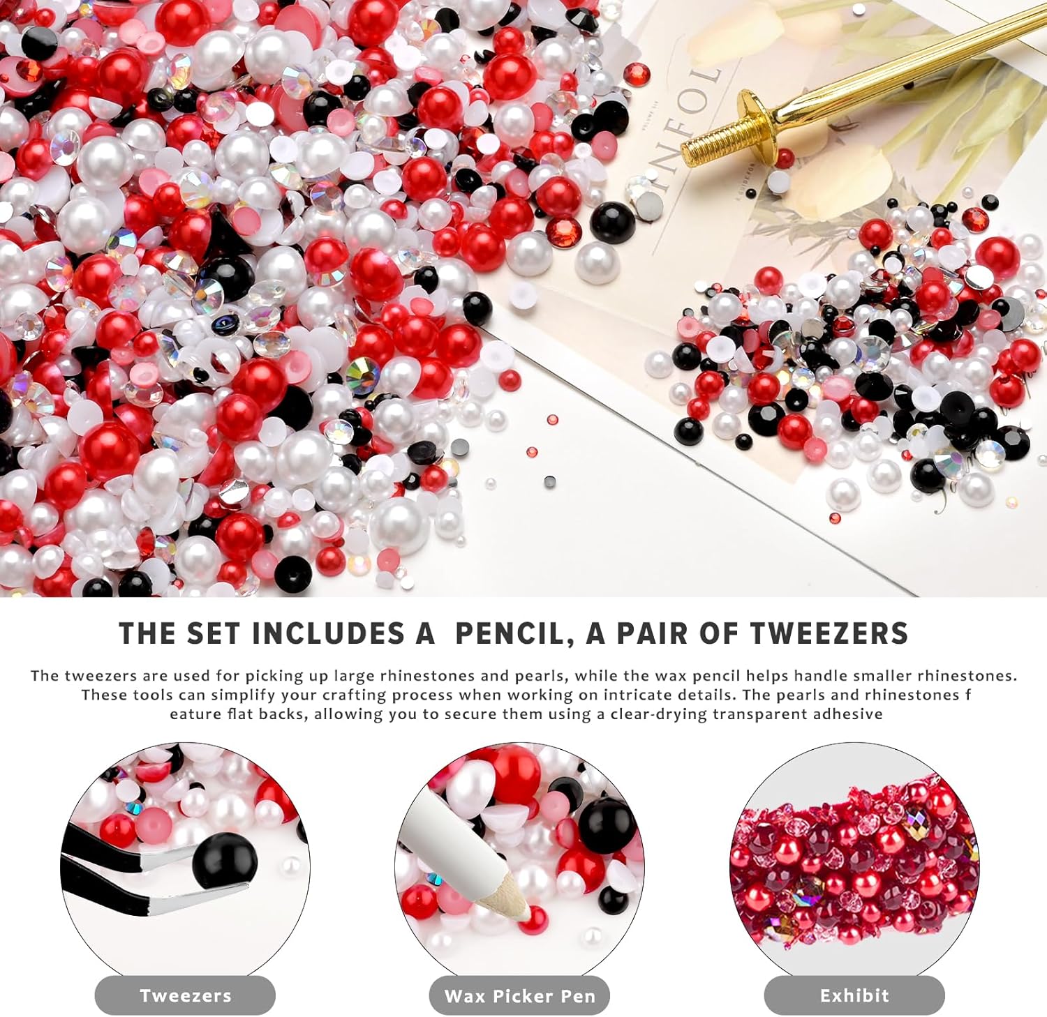 - Complete Crafting Kit: Comes with tweezers, and wax pickup pen effortlessly apply pearls and rhinestones to Any Surface,Which will not harm your nails and skin. The stylish pearl for crafts flat back rhinestones has a pretty and a shiny surface, show your chic and glamour bedazzle gems