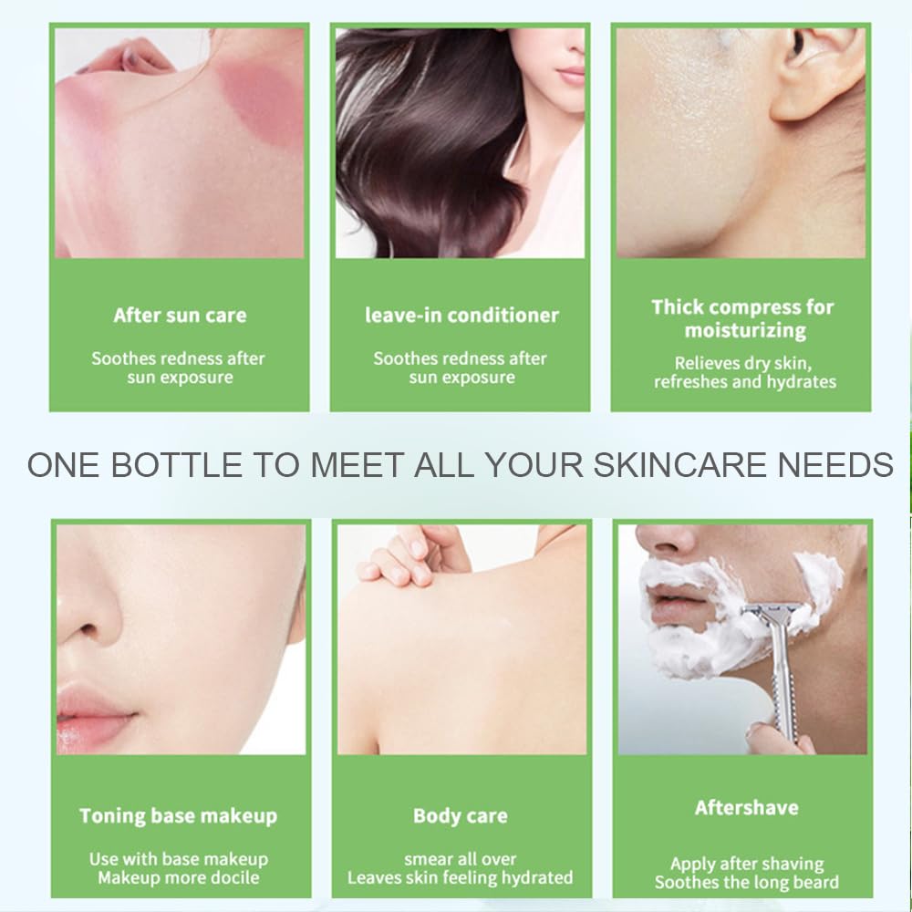- 🌟 5-in-1 Versatility for All Skin Types Use as a face moisturizer, body gel, aftershave relief, sunburn rescue, or hair mask. Instantly calms redness, dryness, and irritation.