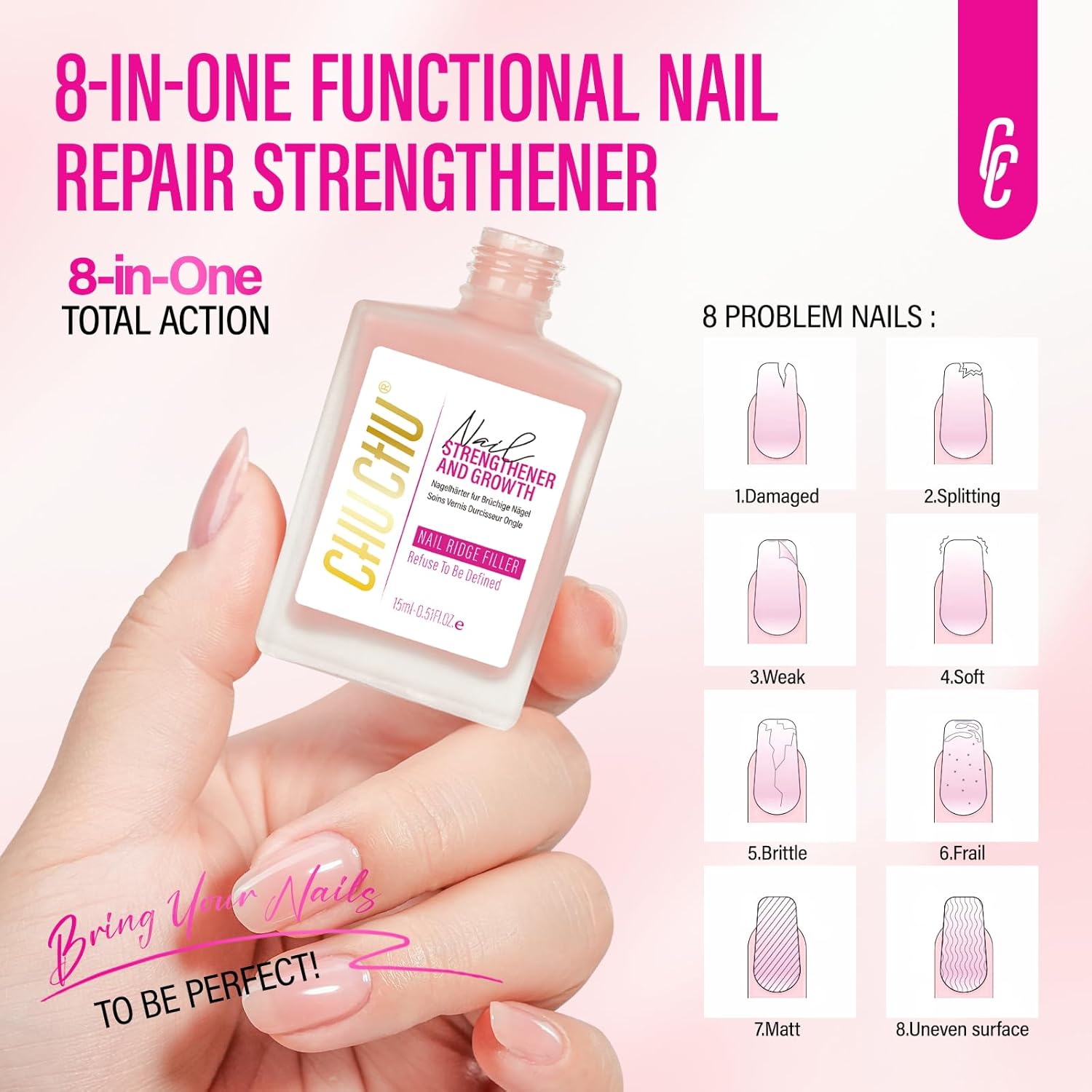 - Transform Your Manicure with Our 8-in-1 Nail Strengthener: Experience the ultimate nail care with our updated formula that combines Nail Protein Strengthening, Base Coat, Nail Ridge Filler, Nail Repair, Quick-Drying, and Nail Polish in one bottle. Perfect for most nail types, this versatile solution simplifies your nail routine and enhances any nail art design effortlessly with a soft, warm pink with a hint of peach.