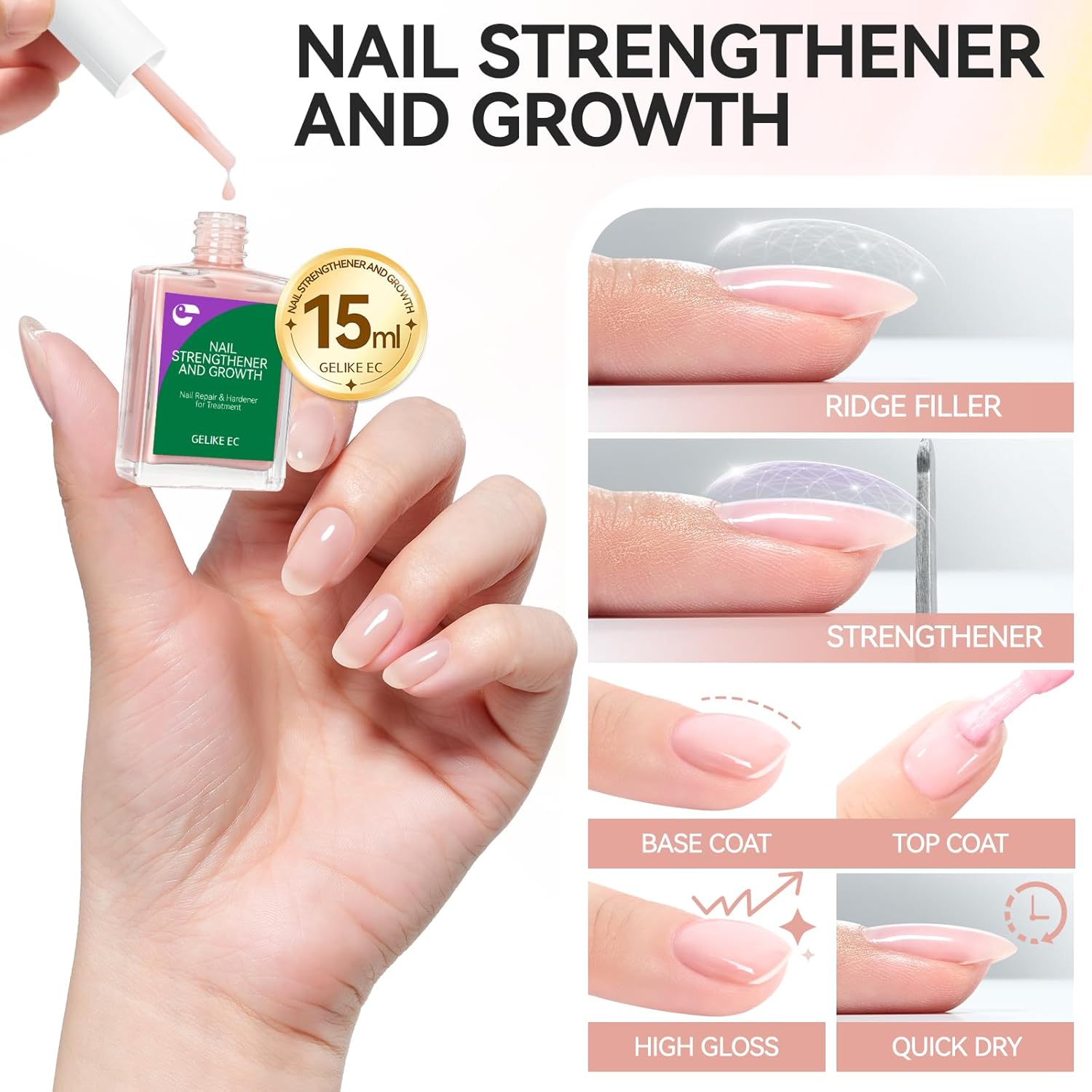 Gelike EC Nail Strengthener for Woman: Nude Blush 15ml 6 in 1 Natural Nail Hardener Extra Strong and Growth - Nail Polish Hardener for Weak and Damaged Nails