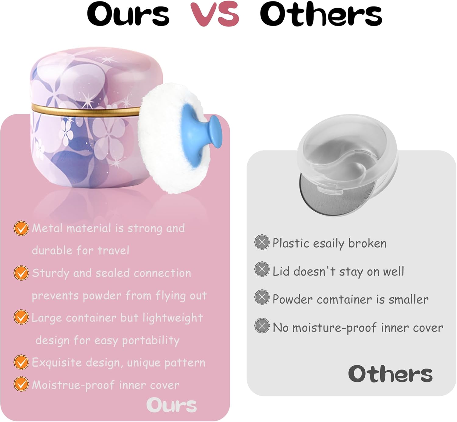 - The powder box has a delicate appearance and a variety of patterns for you to choose. The powder box is made of high-quality tinplate, which are not easy to break after being dropped, and not fade easily, and can be used for a long time. There is also a lid inside the powder box, so you don't have to worry about spilling powder.
