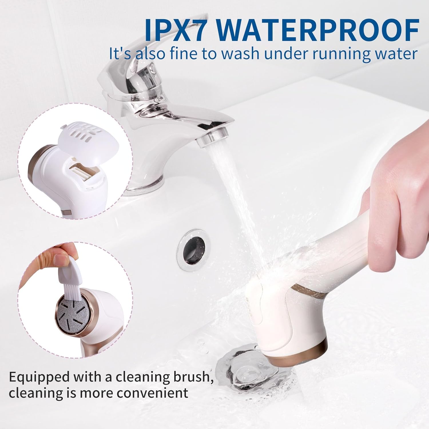 - [IPX7 Waterproof] The electric callus remover is designed with IPX7 waterproof technology, allowing you to clean the body with a strong water flow without worrying about water flowing into the interior. The grinding head is also removable for cleaning.