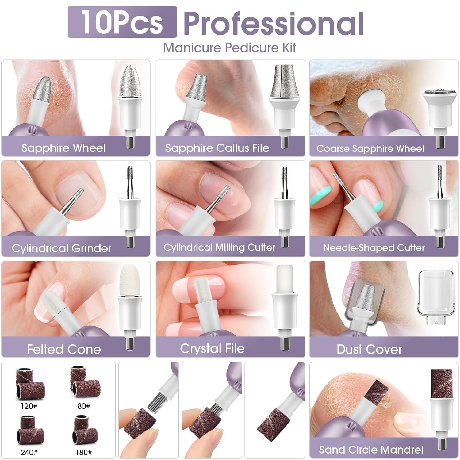- Professional Manicure and Pedicure Set: This electric nail file is design for hand and foot care, can be used for all-around shaping, buffing, grinding, polishing, cuticle, hard skin, callus removing. perfect manicure kit for women trimming, grinding and polishing natural nails and toe nail grinder kit for thick nails. You will enjoy this manicure pedicure tool kits !!!