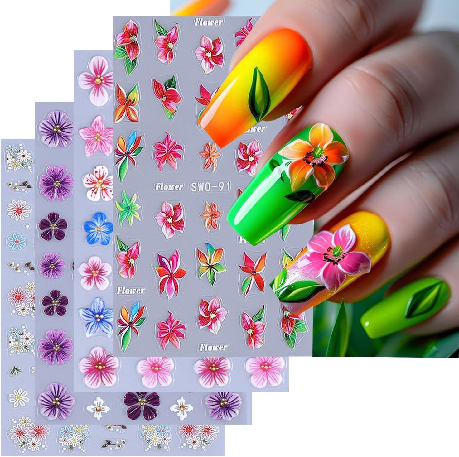 - Quantity:You will get 4 sheets 3D flowers nail art adhesive stickers, each paper measure 3.9 x 2.5 inches(10x6.5 cm). Pink flowers, red flower, blue flower, purple flower, daisy etc patterns design for your choice, these nail stickers are perfect for matching other nail art