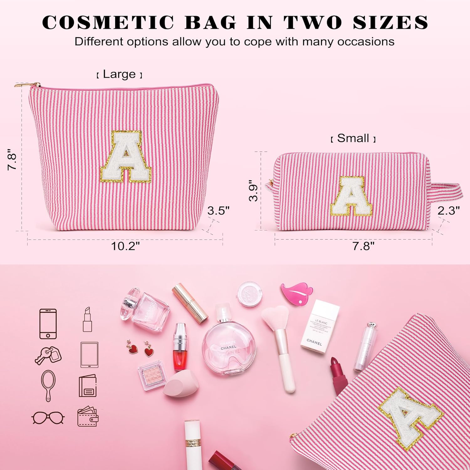 - TRAVEL MAKEUP SET: Large cosmetic bag 10.2"L x 3.5"W x 7.8"H, small pouch 7.8"L x 2.3"W x 3.9"H. Fits perfectly in suitcase compartments or carry-on bags