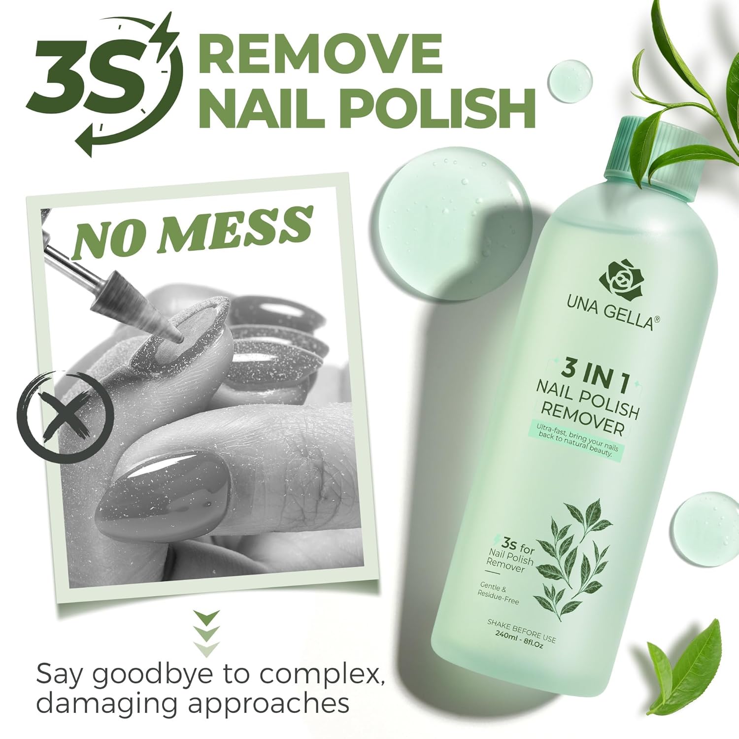 - Quick & Easy Nail Polish Removal: Say goodbye to complicated removal methods. UNA GELLA salon-grade fast-acting acetone nail polish remover erases nail polish with minimal effort - just 3-10 seconds for regular nail polish and 15 minutes for acrylic nails/gel polish/UV gel glue. Warm tip: Fully buff the top coat layer of your nails to help the nail remover penetrate better for faster, more effective removal.