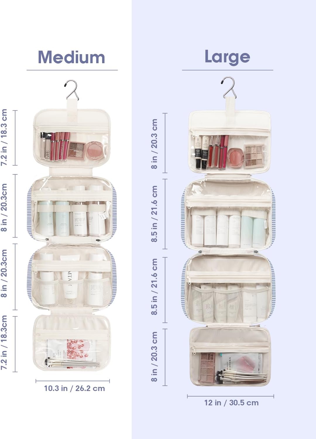 - NOT BULKY DESIGN - Large Capacity yet compact design, weighing 14 ounces. large metal hook allows hanging the toiletry case from towel rack, coat hook or whereever is available, making your toiletries and cosmetics displayed well for easy access