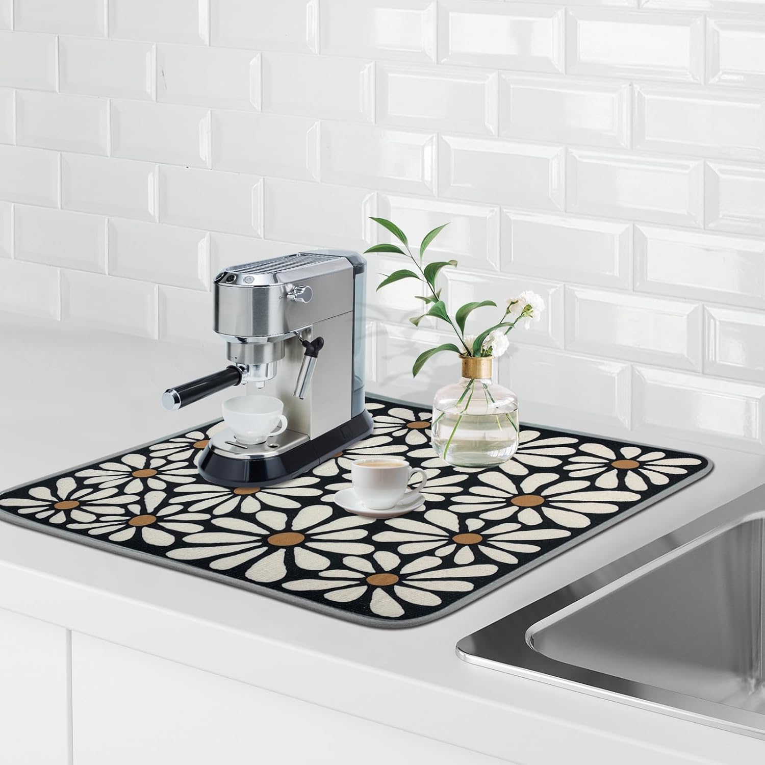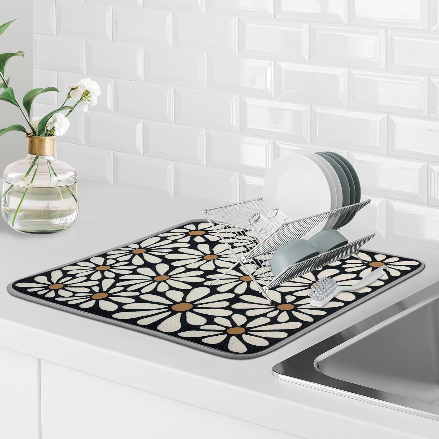 SHIYUE Dish Drying Mat for Kitchen Counter Super Absorbent Spring Kitchen Decor Microfiber Drying Matainers Rack Fast Pad Dish Drainer Mats(Black Flower,18''x24'')