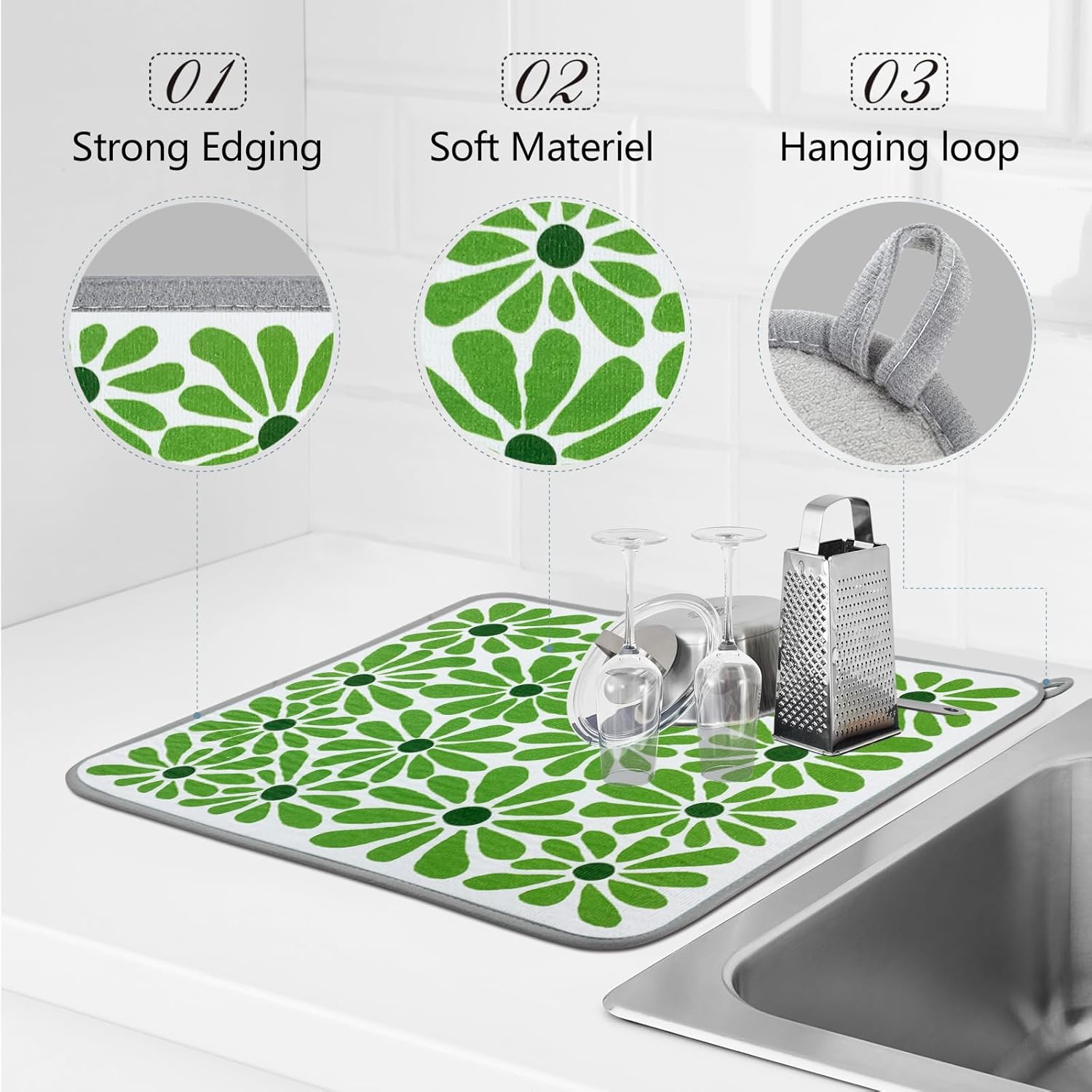 SHIYUE Dish Drying Mat for Kitchen Counter Super Absorbent Spring Kitchen Decor Microfiber Drying Matainers Rack Fast Pad Dish Drainer Mats(Cute Green Flower,18''x24'')