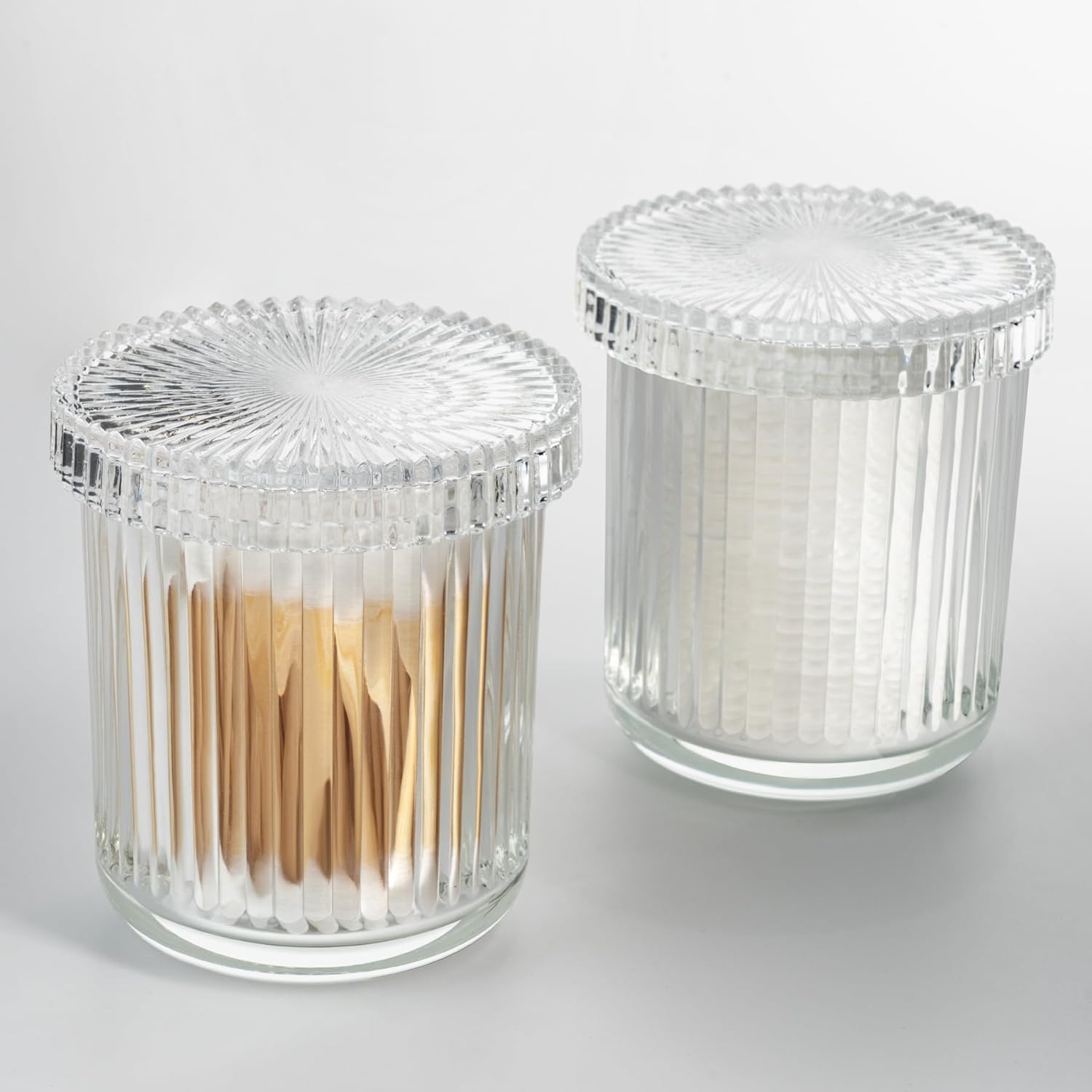 - BATHROOM ORGANIZER & STORAGE - Glass qtip holder with lid (9.8oz, 3.9 x 3.5 inch). Perfect bathroom organizer for cotton swabs, cotton balls, pads, floss picks, bath salts, hair ties, and small bathroom accessories. Keep vanity, countertop, and bathroom storage neat and stylish