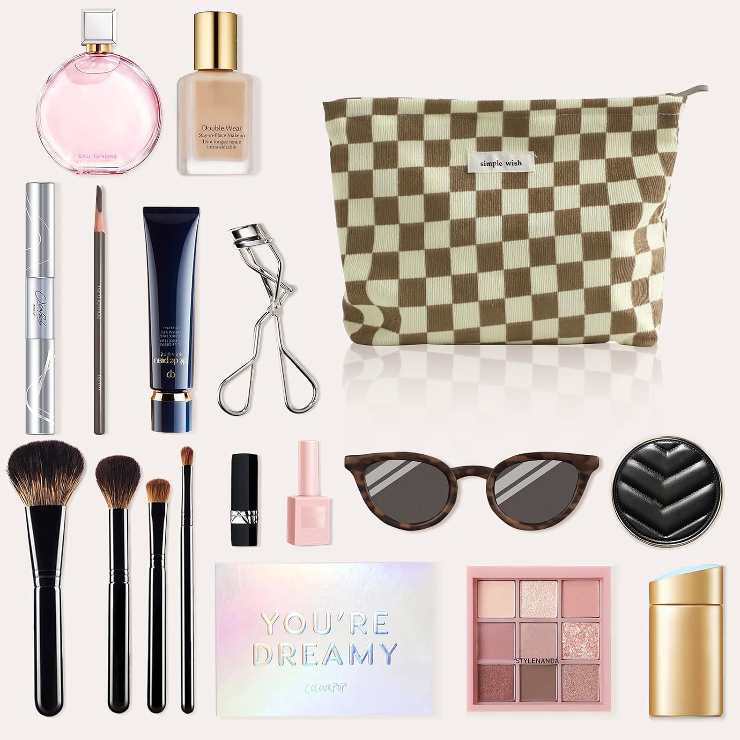 Wudygirl Checkered Makeup Bag Large Capacity Makeup Pouch Travel Cosmetic Pouch for Women Canvas Toiletry Bag Zipper Handbag Aesthetic (Khaki Checkered)