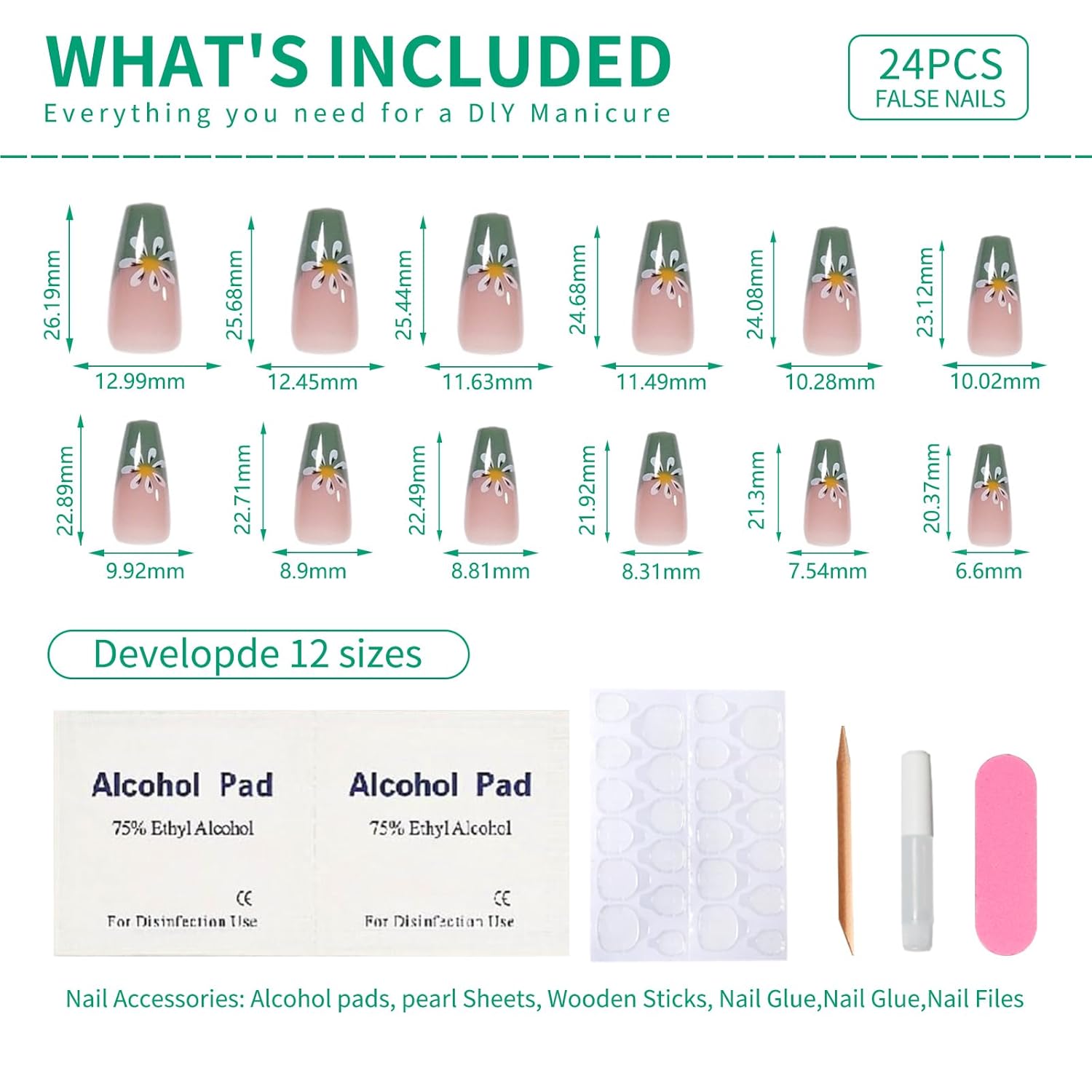 - Product Description: Grace meets freshness in these nude coffin nails with green French tips and elegant white floral accents. The glossy gel finish adds salon-like shine, while the thick, durable design ensures a secure and comfortable fit. Effortless to apply and beautifully natural on every fingertip.