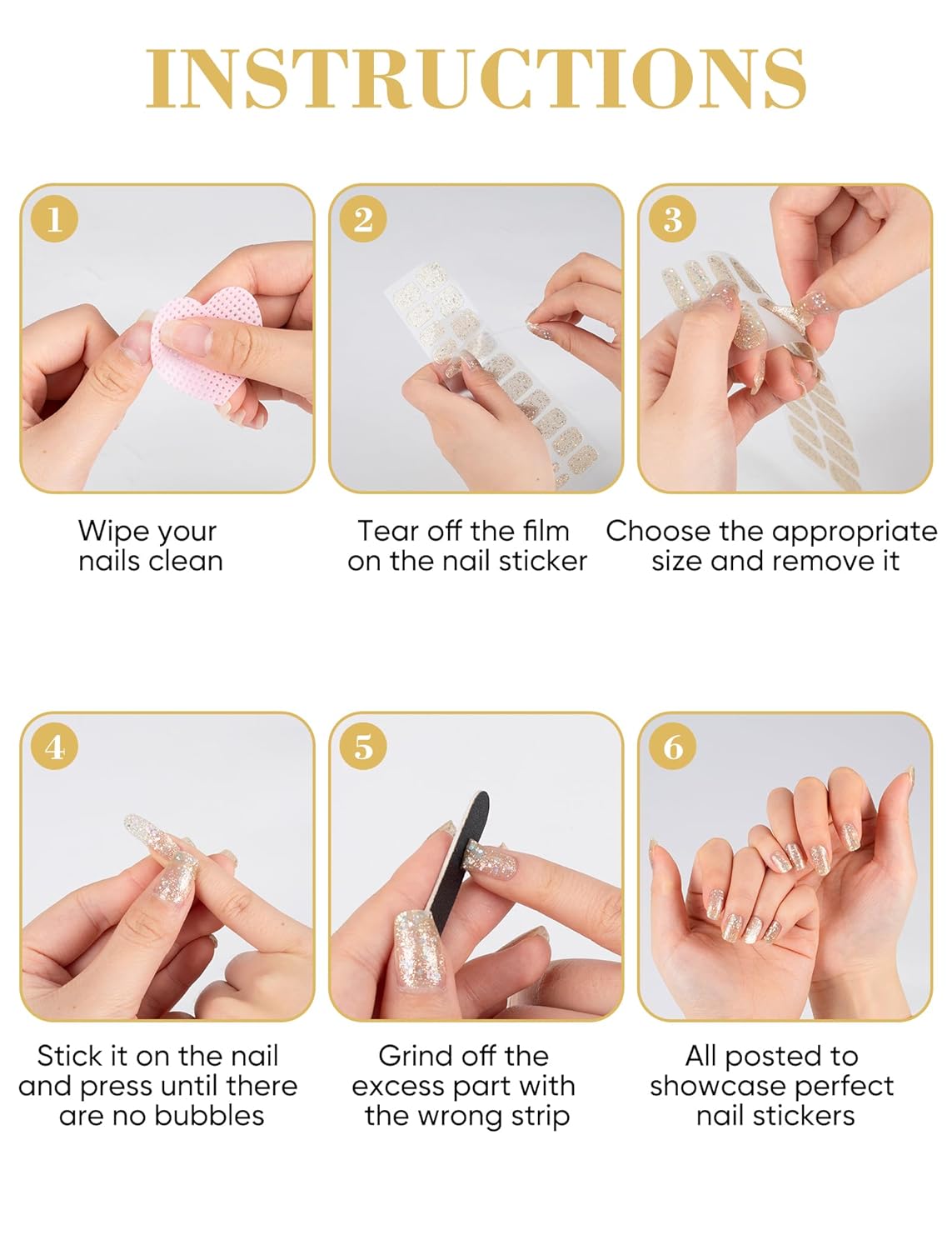 - All-in-One Starter Kit: This nail stickers set includes 48 elegant nail strips, one precision nail file for shaping, and two heart-shaped cleaning blocks to prepare your nails before application