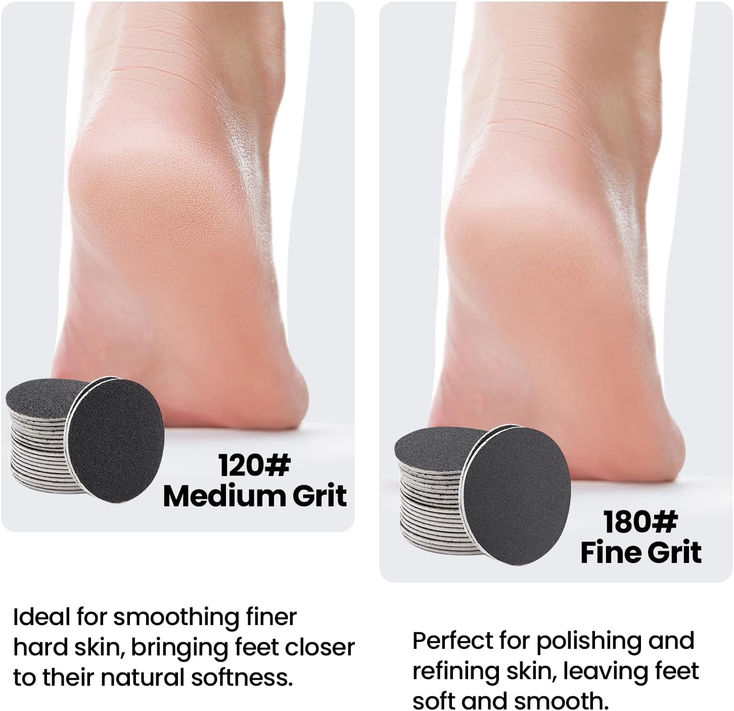 - How to choose the suitable foot file sandpaper discs refill: 80 grit is coarser than 120 grit, and 120 grit is coarser than 180 grit