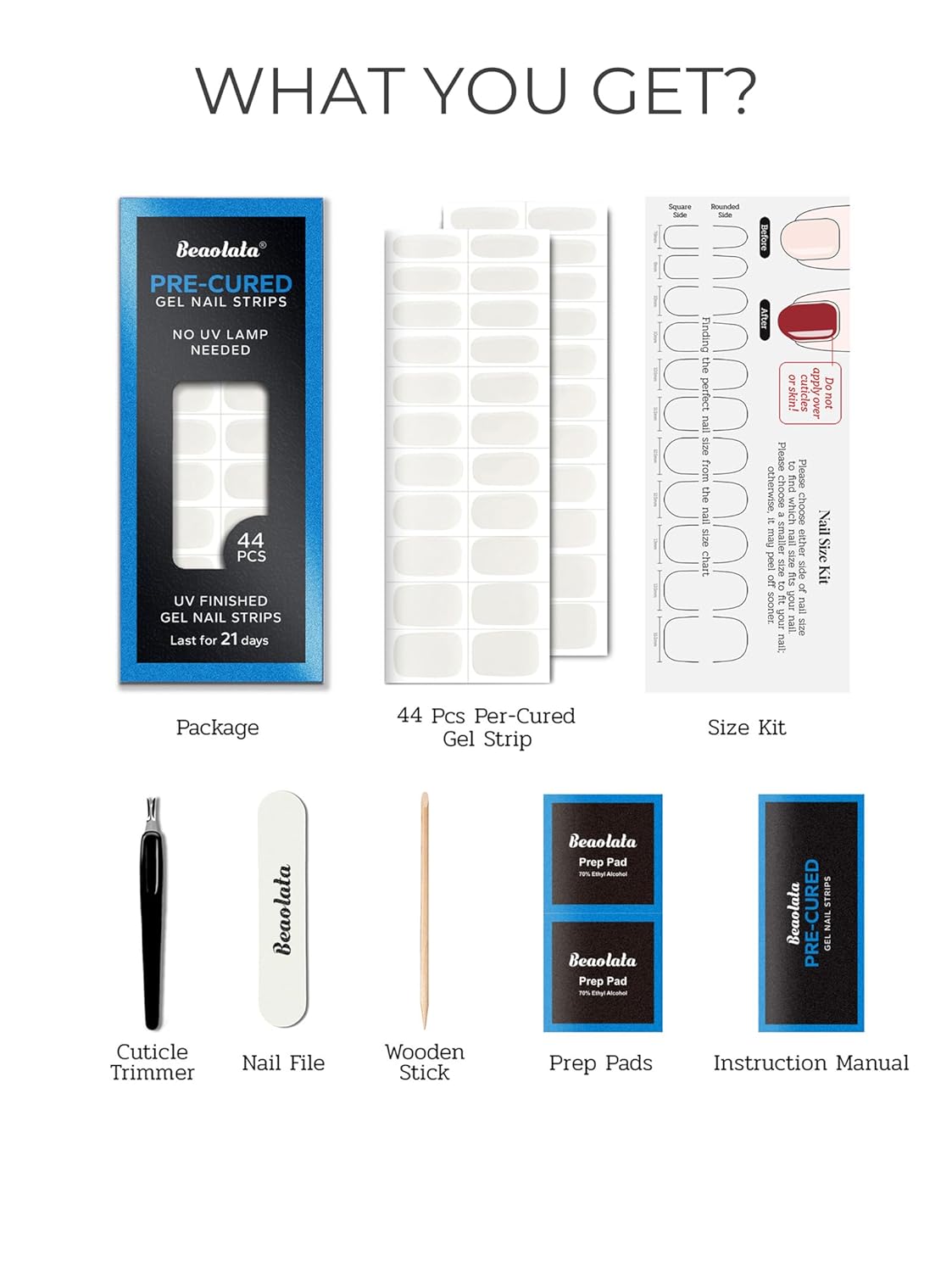 - Pre-Cured gel nail strips : Beaolata pre-cured gel nail strips utilize innovative technology that combines color gel with top coat gel, Professional Nail Results but no UV Lamp Needed.