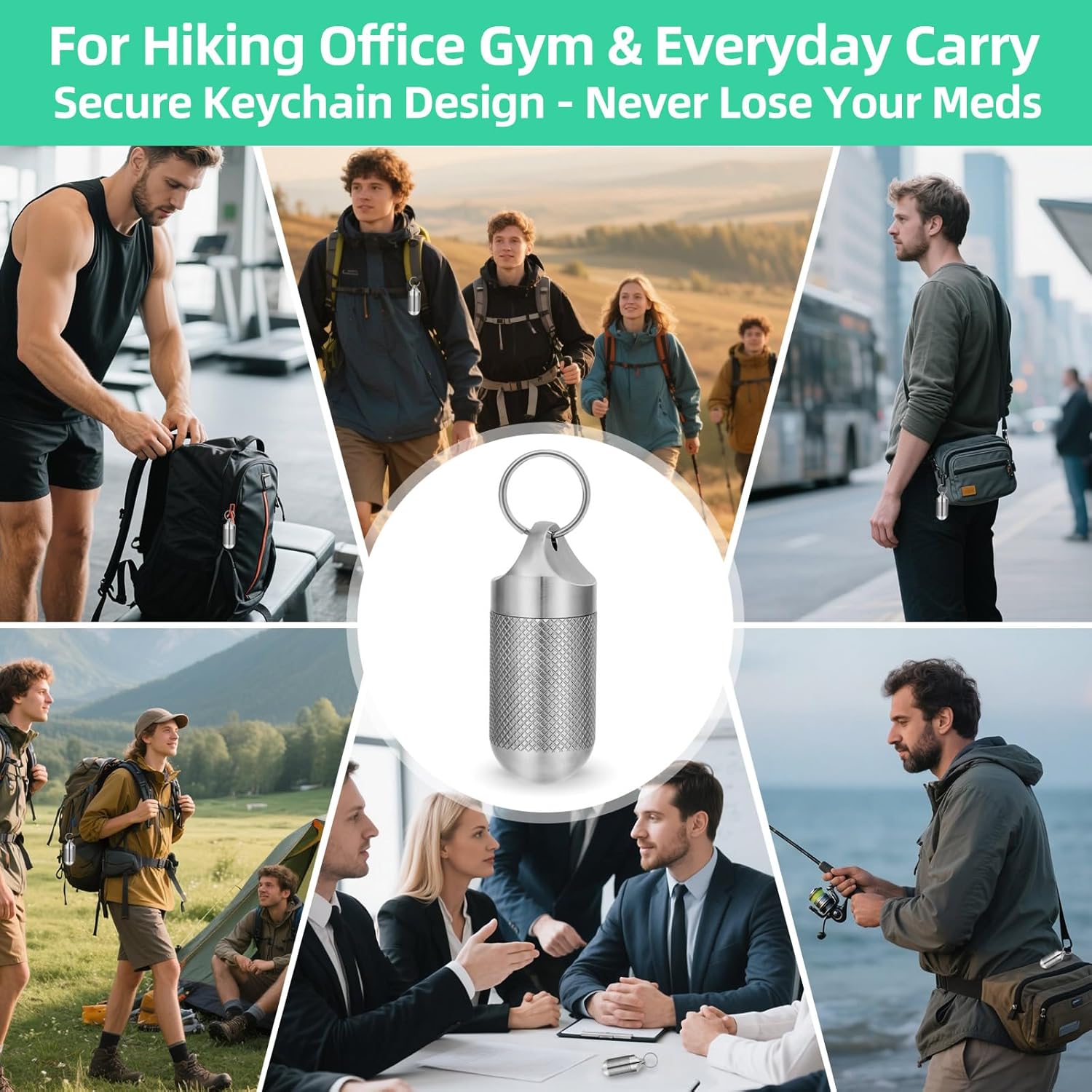 - Core Features & Benefits Crafted from 99% pure titanium—non-toxic, hypoallergenic, corrosion-resistant, and pressure-resistant. Withstands extreme temperatures. Titanium, a material used in aerospace technology, ensures pharmaceutical safety. Higher cost than plastic/metal alternatives, but unmatched safety. Screw-top lid with waterproof silicone ring—no spills from sweat, rain, or outdoor activities. Preserves medication purity and efficacy. No disruptive snapping sounds—ideal for discreet use in meetings, theaters, or public spaces. Stainless steel hook attaches to keys, backpacks, belts, etc. Versatile for commuting, hiking, cycling, and more