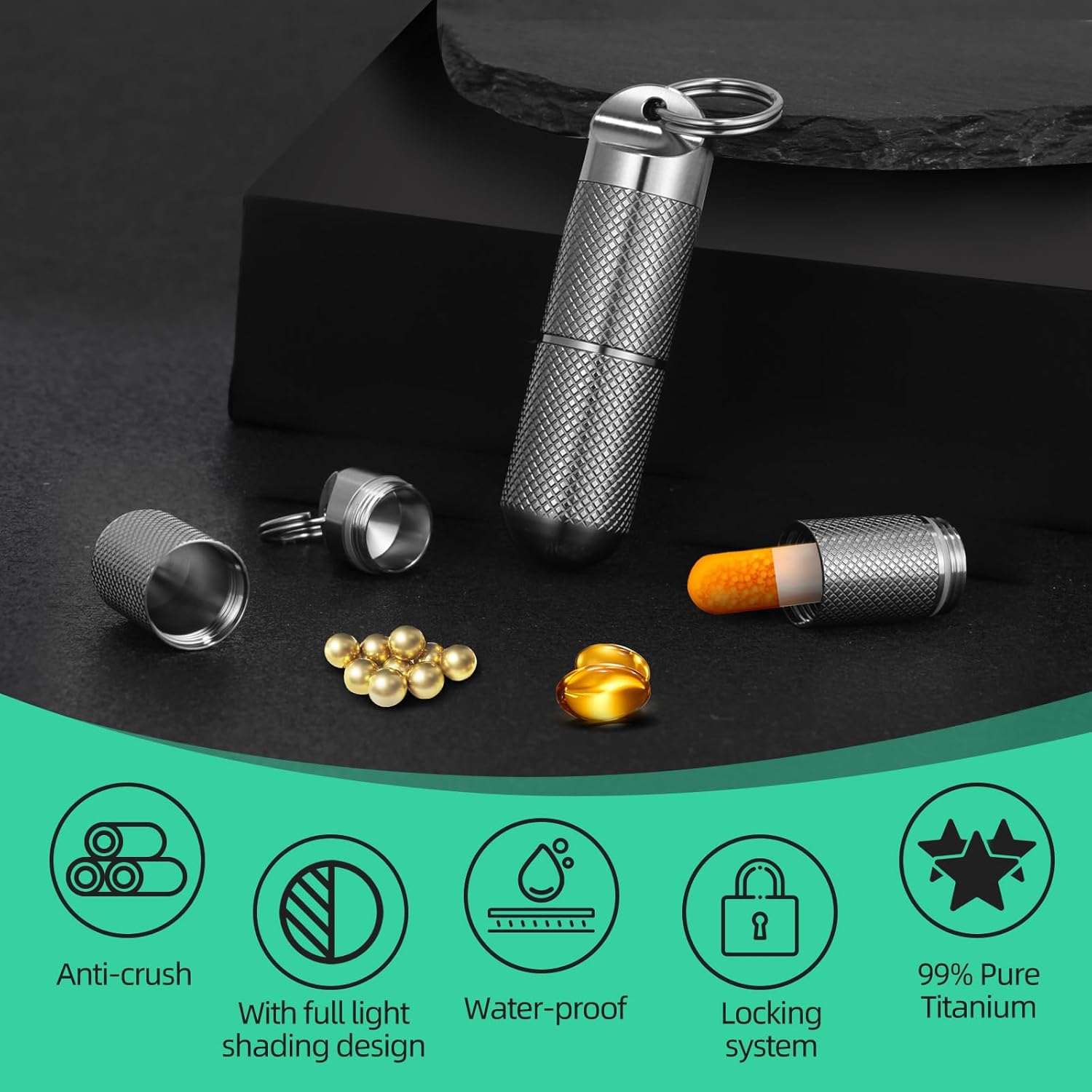 - Core Features & Benefits Crafted from 99% pure titanium—non-toxic, hypoallergenic, corrosion-resistant, and pressure-resistant. Withstands extreme temperatures. Titanium, a material used in aerospace technology, ensures pharmaceutical safety. Higher cost than plastic/metal alternatives, but unmatched safety. Screw-top lid with waterproof silicone ring—no spills from sweat, rain, or outdoor activities. Preserves medication purity and efficacy. No disruptive snapping sounds—ideal for discreet use in meetings, theaters, or public spaces. Stainless steel hook attaches to keys, backpacks, belts, etc. Versatile for commuting, hiking, cycling, and more