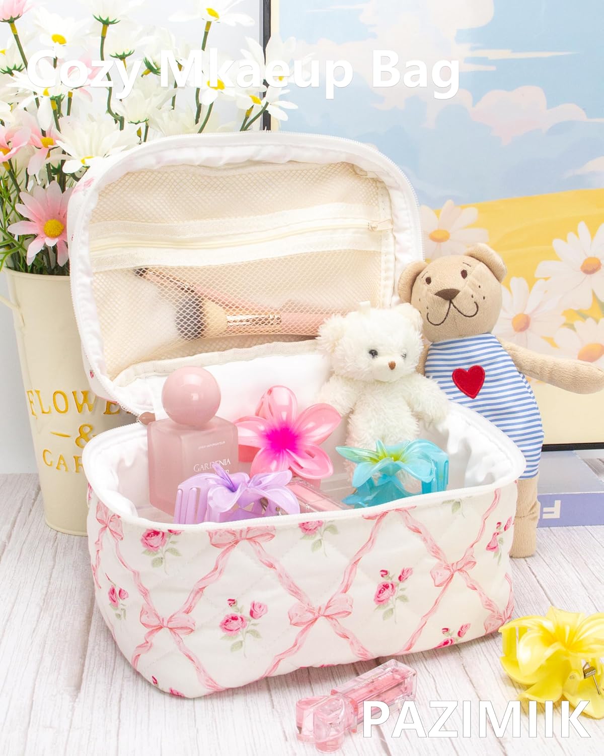 PAZIMIIK Quilted Makeup Bag Large Travel Zipper Soft Cosmetic Case for Women Girls Make Up,Bow Rose