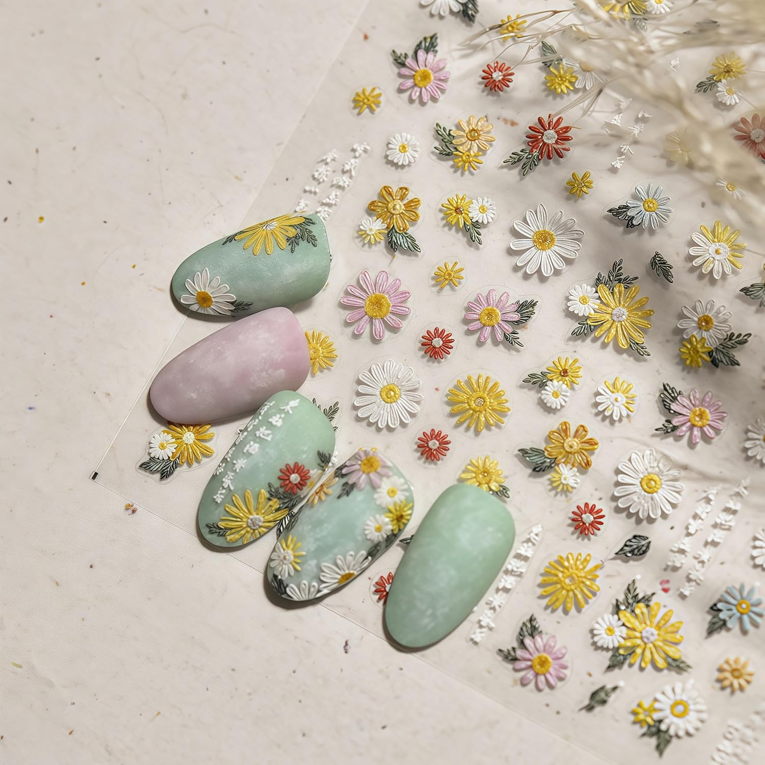 - Spring Daisy Self-adhesive Design: 5D cute nail decals for nail art design is simple and quick to use, nail stickers work great on bare nails, they will stay on for a long time and will not peel off your nails, enjoy the feeling of nail art