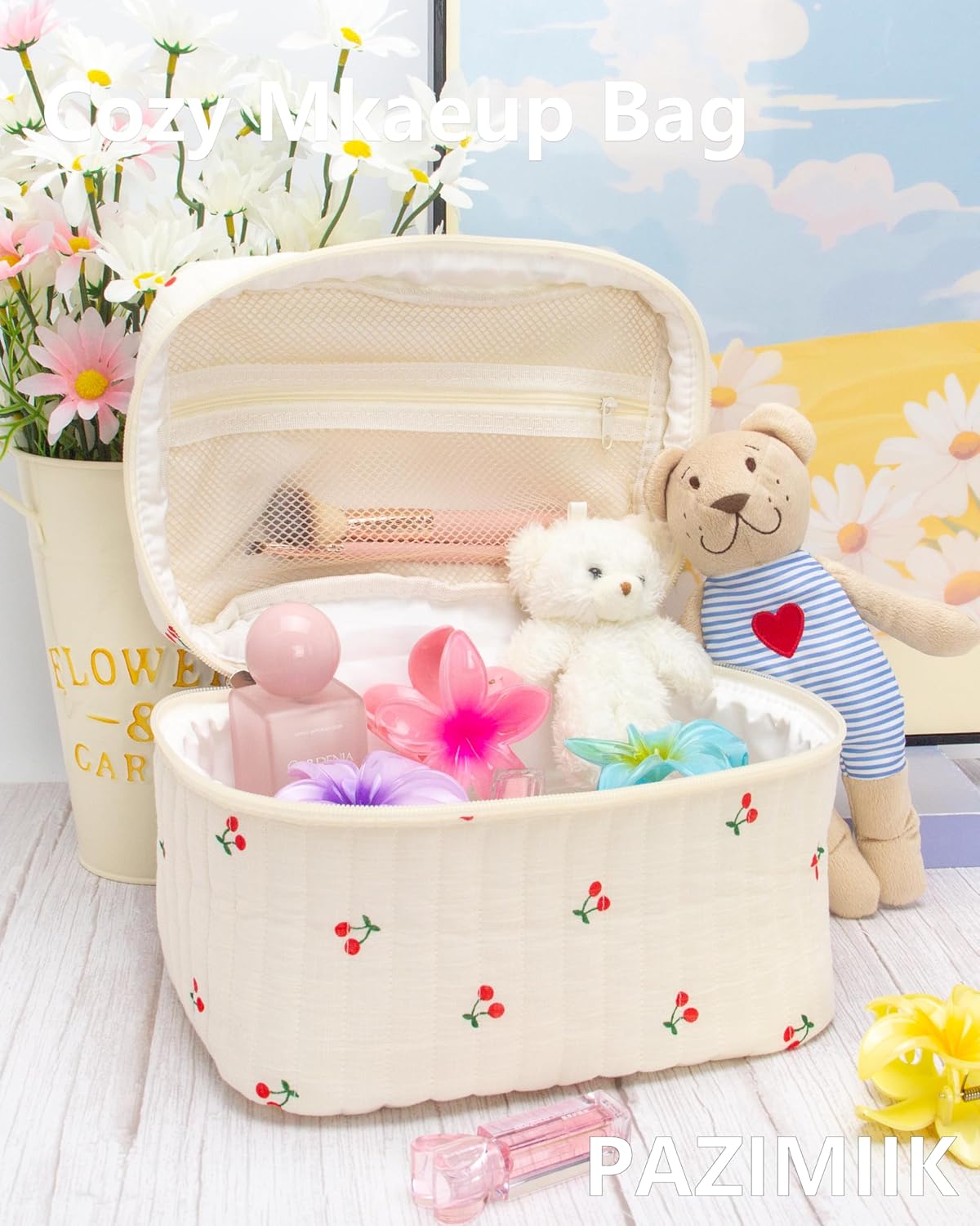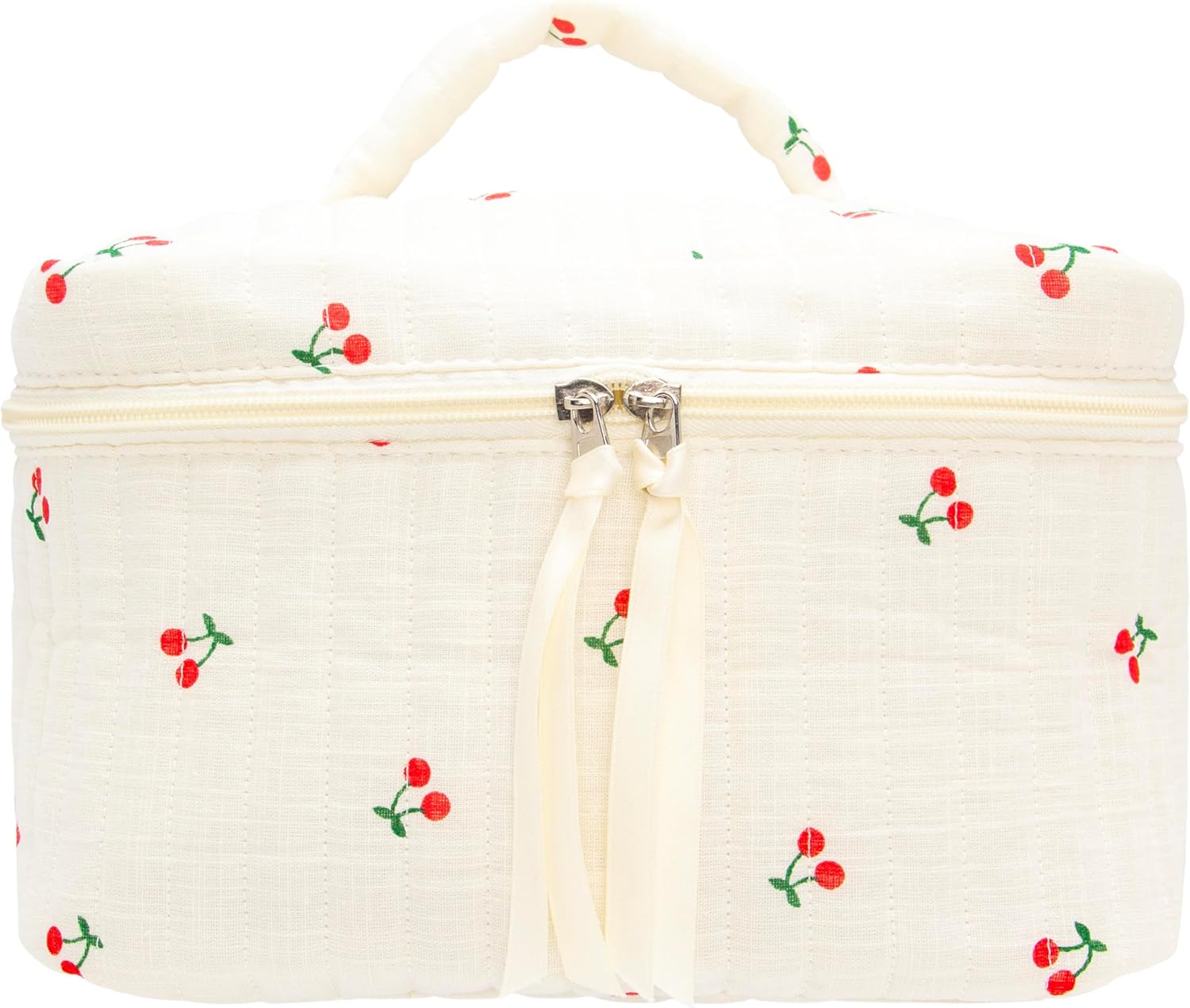 PAZIMIIK Quilted Makeup Bag Large Travel Zipper Soft Cosmetic Case for Women Girls Make Up,Cherry Beige