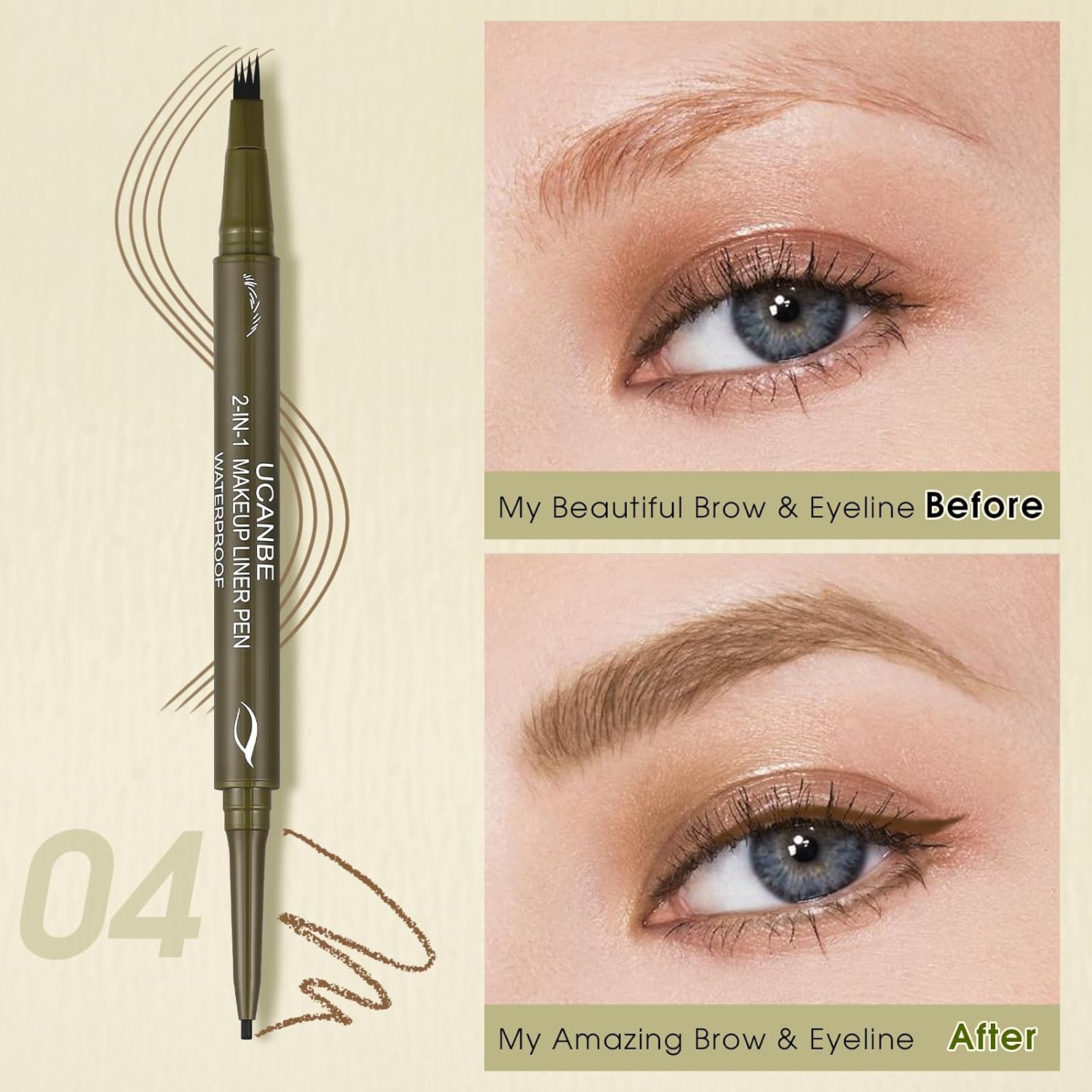 - 【Dual-Ended Eyebrow Pen & Gel Liner Pencil】UCANBE Innovative 2-in-1 eyebrow pen features eyebrow pencils for women with 4 micro-fork tips on one end to effortlessly fill colors in brow gaps and draw natural hair-like strokes, and on the other end, a gel eyeliner pencil with creamy formula glides on easily to create subtle lines, precise definition, intensely smokey vibes and custom brow & eyeline makeup looks.
