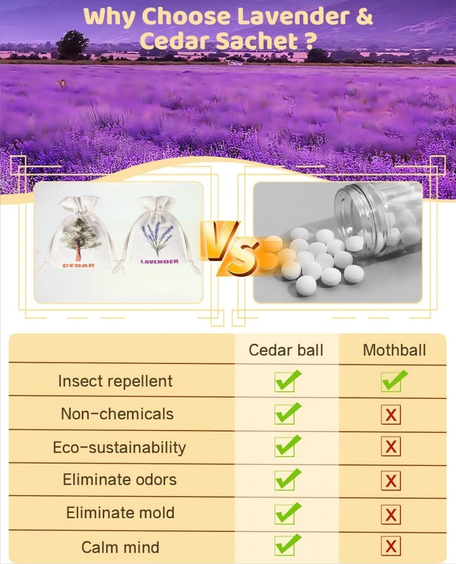 - Natural and Safe: Our sachet bags are made from 100% natural ingredients, providing a safe and eco-friendly option for your family. The combination of cedar blocks for clothes storage and lavender not only imparts a delightful scent but also protects your garments