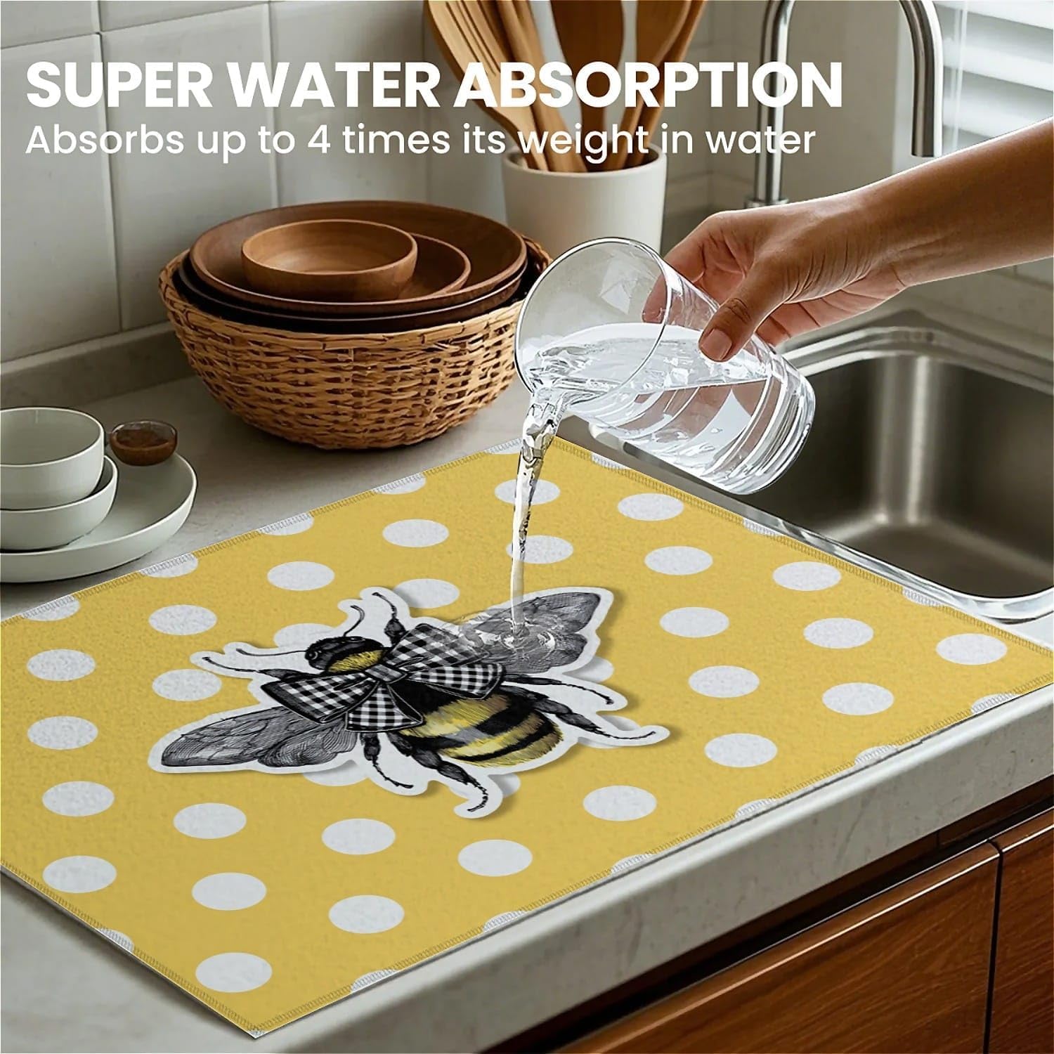 Dish Drying Mat For Kitchen Counter, Yellow Honey Bees Microfiber Absorbent Dish Drainer Rack Pad Reusable Large 18x24in Drying Mat
