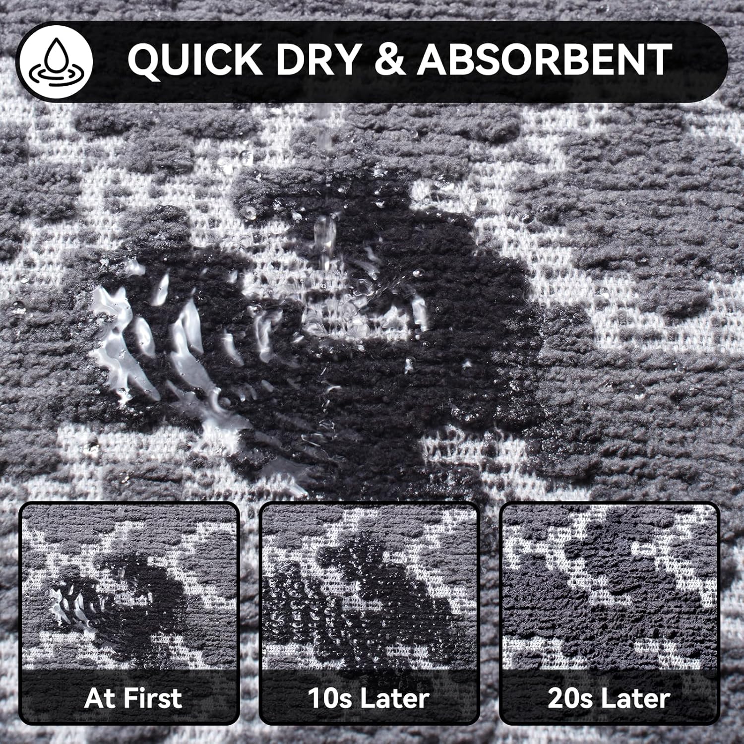 - Quick Dry & Super Absorbent:This chenille material can immediately dry your feet when you step on them, keep the water to stay on and in the mat and not spill over onto the floor,and prevent the floor from getting wet