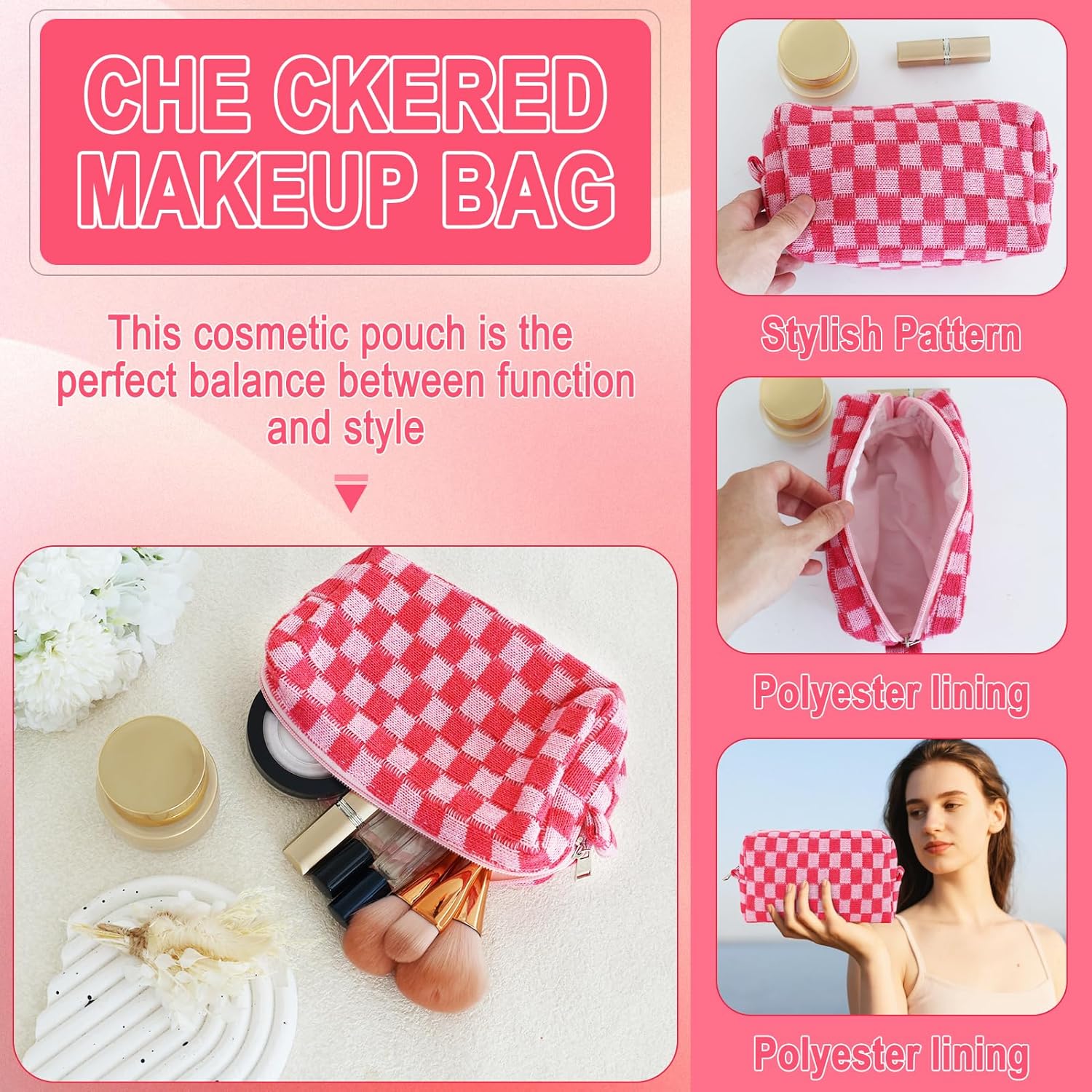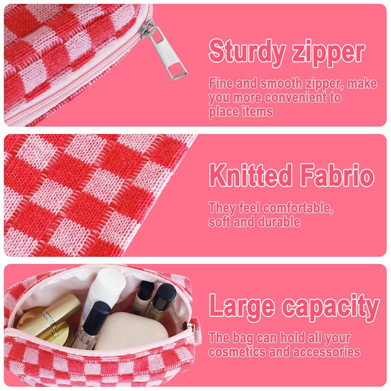 - LIGHT WEIGHT AND EXCELLENT WORKMANSHIP: The cute makeup pouch is made of soft knitted fabric and is comfortable, soft and lightweight. Checkered travel make up bag folds up when not in use and fits in a large bag without taking up space. The metal zipper of the cute pencil case keep your items secure and organized inside. Cosmetic bag accessories set for women