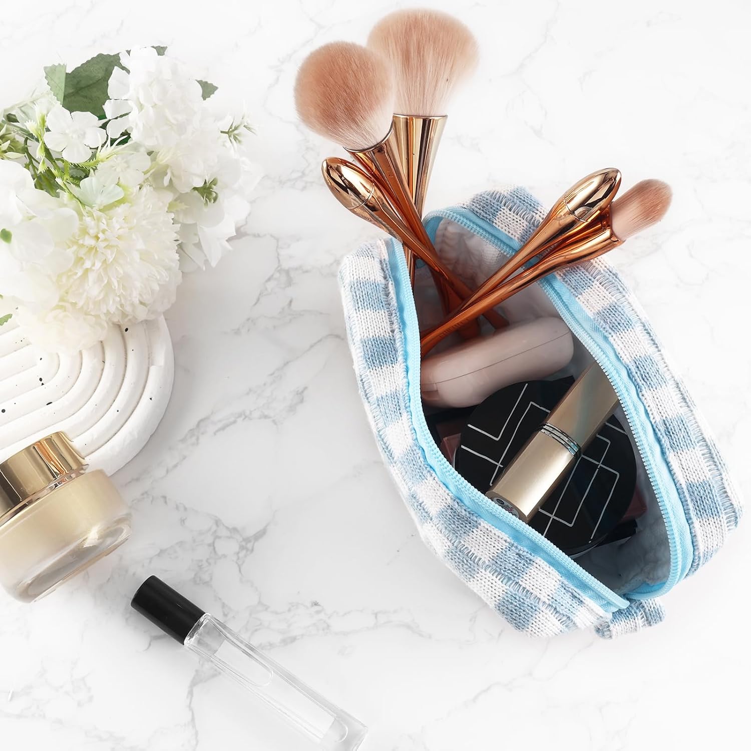 - LARGE CAPACITY AND PREMIUM MATERIAL: The cute makeup bag measure 7.1×4.3 inches, easy to carry. The checkered makeup bag is made of soft knitted fabric, easy to clean. The smaller ones can be used as pencil case or pencil pouch.This makeup travel bag can also hold small items such as makeup, skincare products, lipstick, eye shadow, eyebrow brush, etc. Makeup storage bag for women toiletries