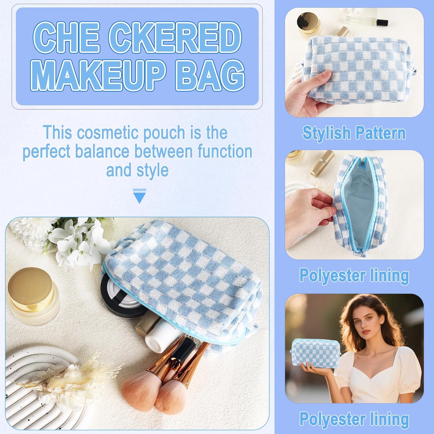 - LIGHT WEIGHT AND EXCELLENT WORKMANSHIP: The cute makeup pouch is made of soft knitted fabric and is comfortable, soft and lightweight. Checkered travel make up bag folds up when not in use and fits in a large bag without taking up space. The metal zipper of the cute pencil case keep your items secure and organized inside. Cosmetic bag accessories set for women