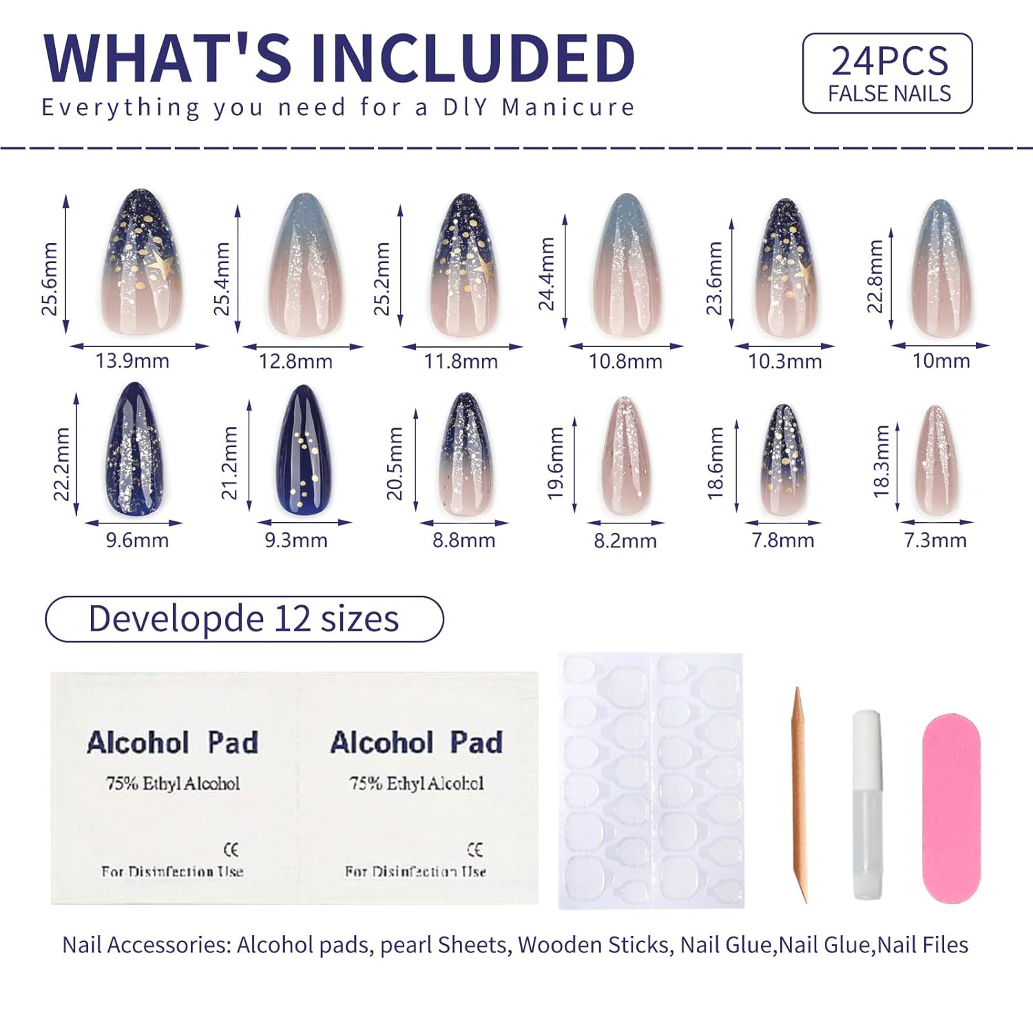 Ombre Press On Nails medium, Almond Fake Nails Featuring a Nude-to-Blue Gradient and accented with golden glitte, Glossy Finish Acrylic Nails, Reusable Glue On Nails for Women, 24Pcs, Golden Tide