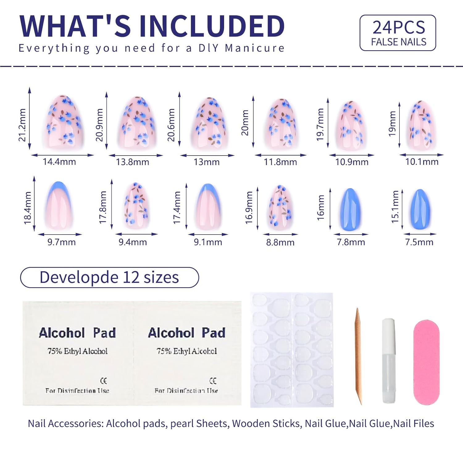 Summer Fall Press On Nails Short Almond, Nude and Blue Fake Nails Featuring Blue Floral Accents, Glossy Finish Acrylic Nails, Thick Reusable Glue On Nails for Women, 24Pcs