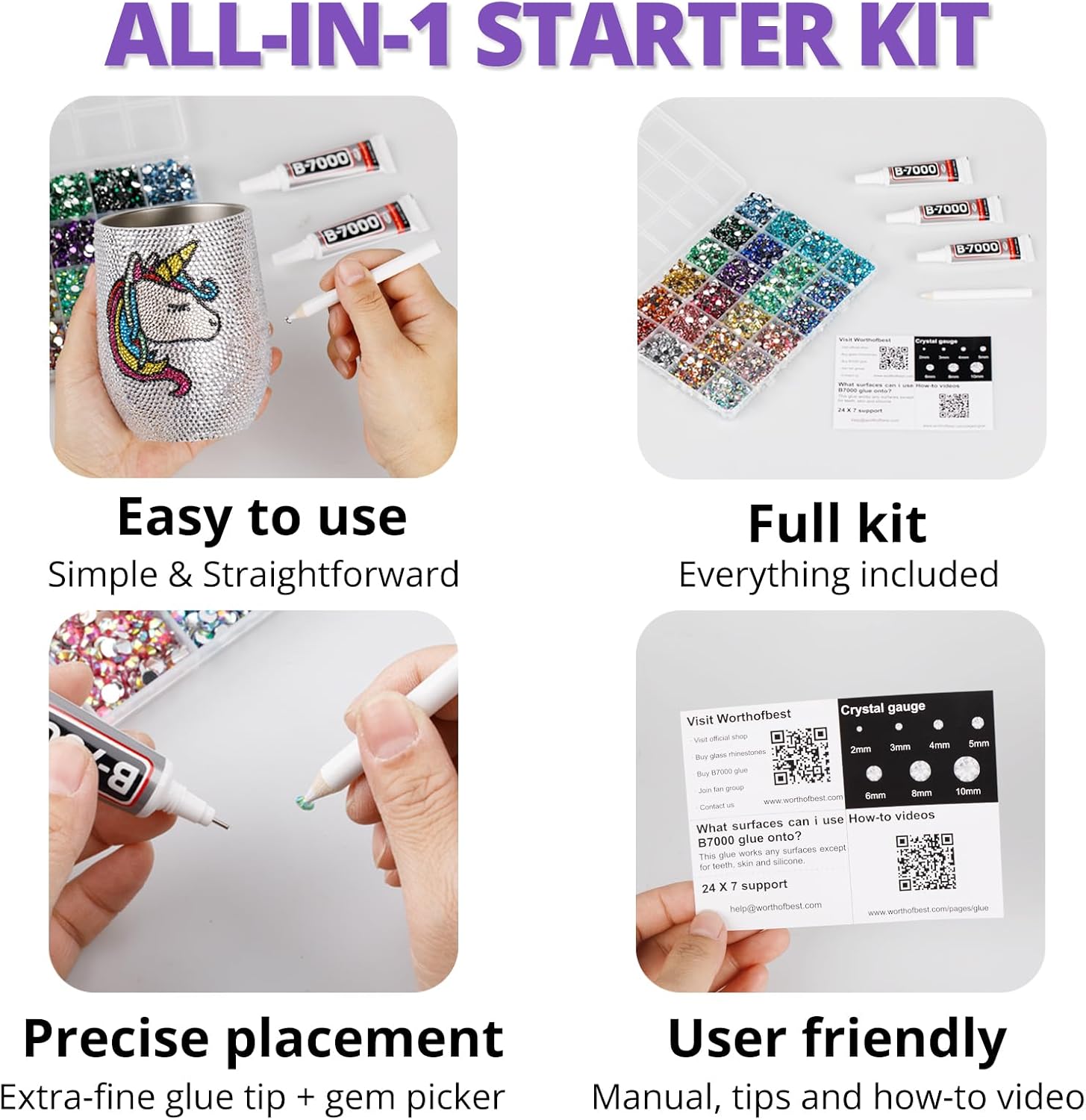 - Easy to Use -- This kit is designed to be straightforward, and versatile for various crafting projects. The manual is user-friendly and beneficial for both novice and experienced crafters. The complete and durable tools are suitable for precisely applying rhinestones to create intricate designs, with no additional tools required. Rhinestones are easy to apply and remove. The sturdy container with 24 grids keeps all rhinestones organized by size and color, making them easy to store and access