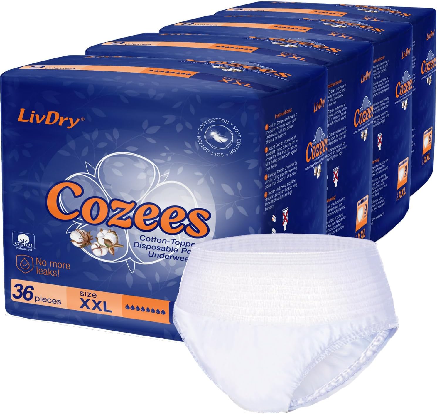 Cozees Disposable Period Underwear for Women, Menstrual and Postpartum High Absorbency, Cotton Covered Comfort, Made in USA (36 Count, XX-Large)