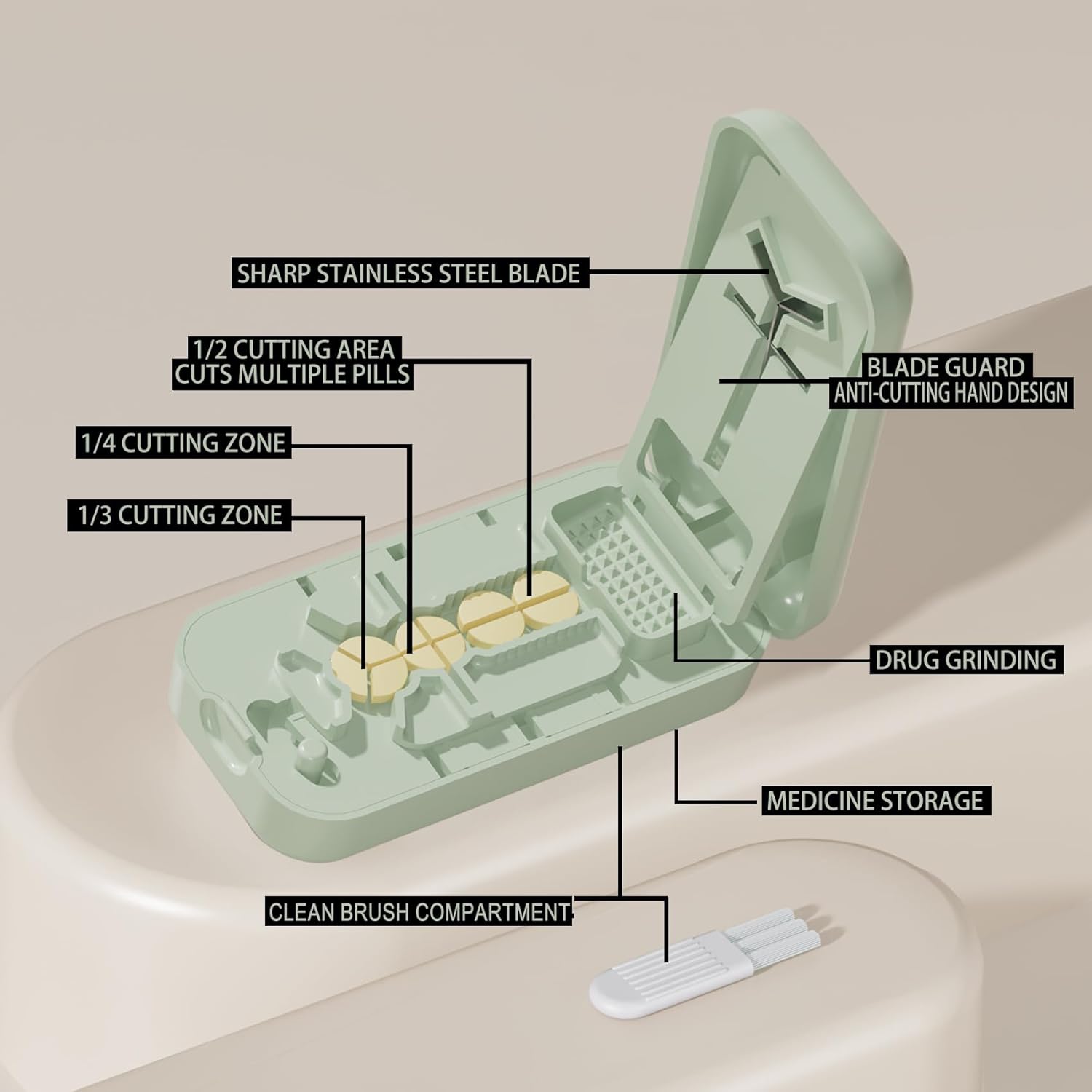 - All-in-One Design – Features a removable grinding tool to crush pills into powder and a built-in storage compartment for easy organization of daily medications.