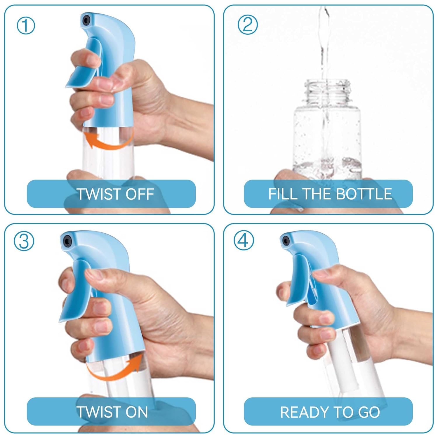- High Quality: The continuous mist spray bottle is made of quality PET material with advanced technology, strong and not easily dented, durable and refillable. BPA-free, no smell, no leakage, and refillable. If anything goes wrong with your continuous spray bottle, please contact us directly.