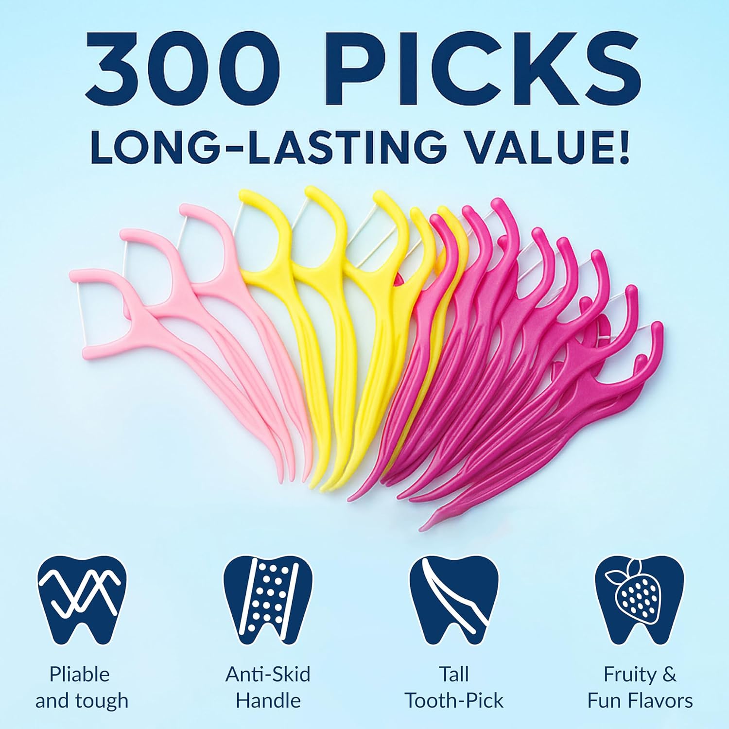Flavored Floss Picks, 300 Count, Dental Floss Picks for Teeth with Fun Fruit Flavors, Flosser Picks for Adults and Children, | Strawberry, Lemon & Raspberry Flavor