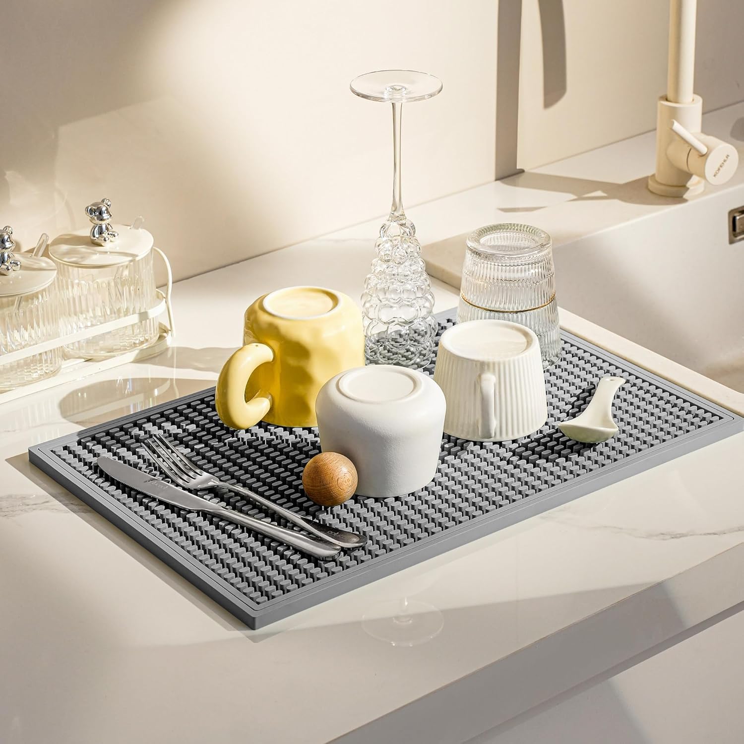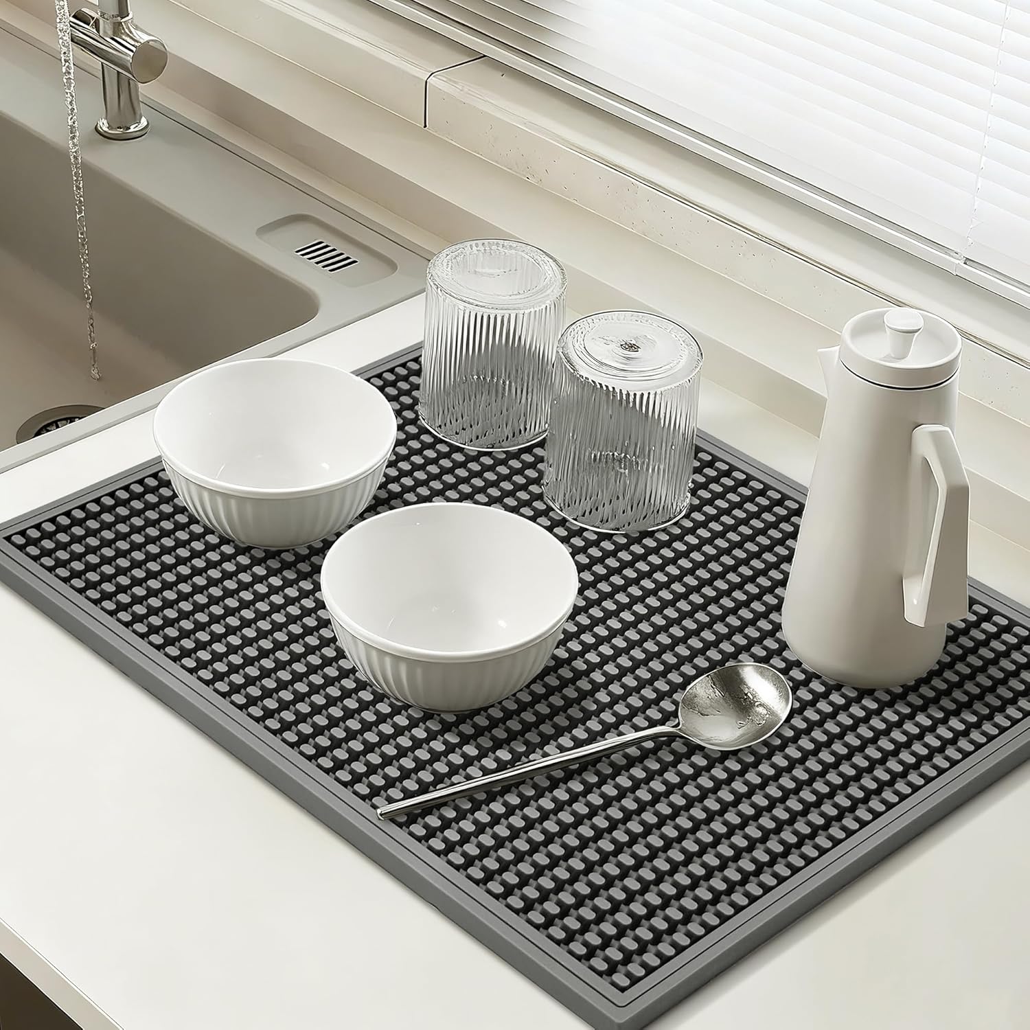 - Superior Drainage & Ventilation: Engineered with deep grooves and elevated ridges, this dish drying mats for kitchen counter promotes rapid airflow and prevents water pooling. Spills stay contained within the edges, keeping countertops dry and tidy. Say goodbye to soggy dish mat drying kitchen mat messes and hello to faster drying times!