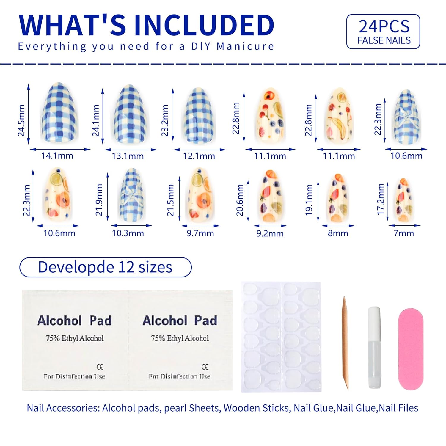 - Package Includes: 24 pcs stick on false glue on nails kit, each box includes 24 short press on nails, 1 sheet of 24 sticky nail pieces, 1 cuticle stick, 1 double sided nail file and gel press on nails cleaning pads, a small tube of nail glue,All the tools you need to apply the nails are included in one set